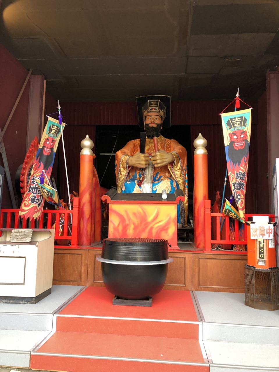 登別温泉のメインストリートにあります。見た目が張りぼてぽくてちょっとちゃちい感じがします。1日の内に何回か閻魔大王が変身?するようですが、残念ながら時間が合わずに見れませんでした。隣の食堂で登別B級グルメの閻魔焼きそばがいただけます。
