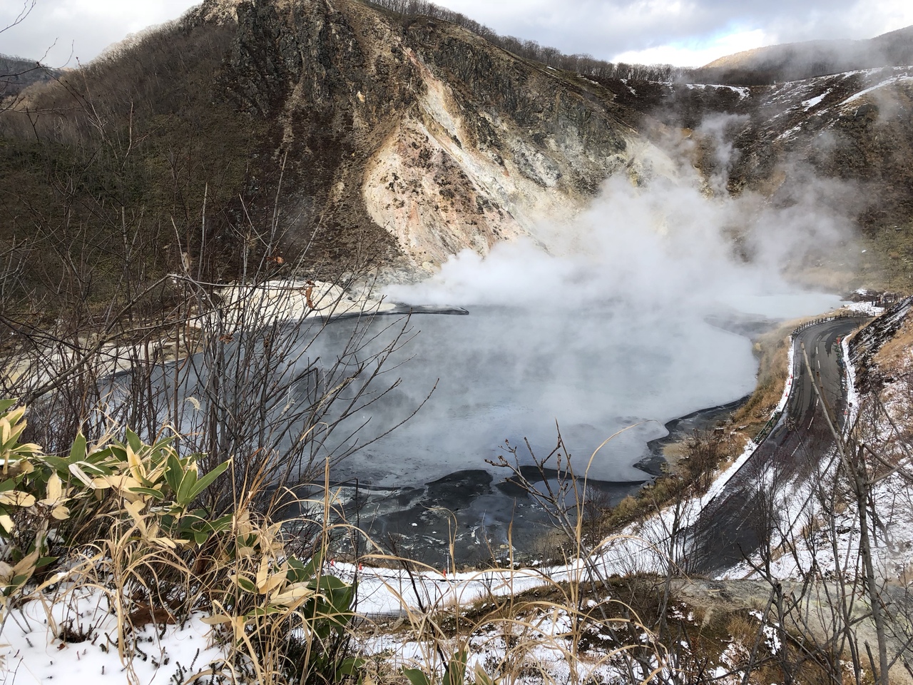 地獄谷から大湯沼の展望台は徒歩10分ぐらいで行けます。沼と言っても大きな池のようで湯気が立っているのは不思議な感じです。地獄谷からの道中は坂道で雪が降って少し雪が残っているので普通のスニーカーではちょっと厳しい箇所があります。滑り止めの効いた靴が良いかと思います。
