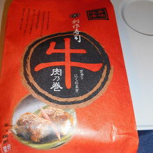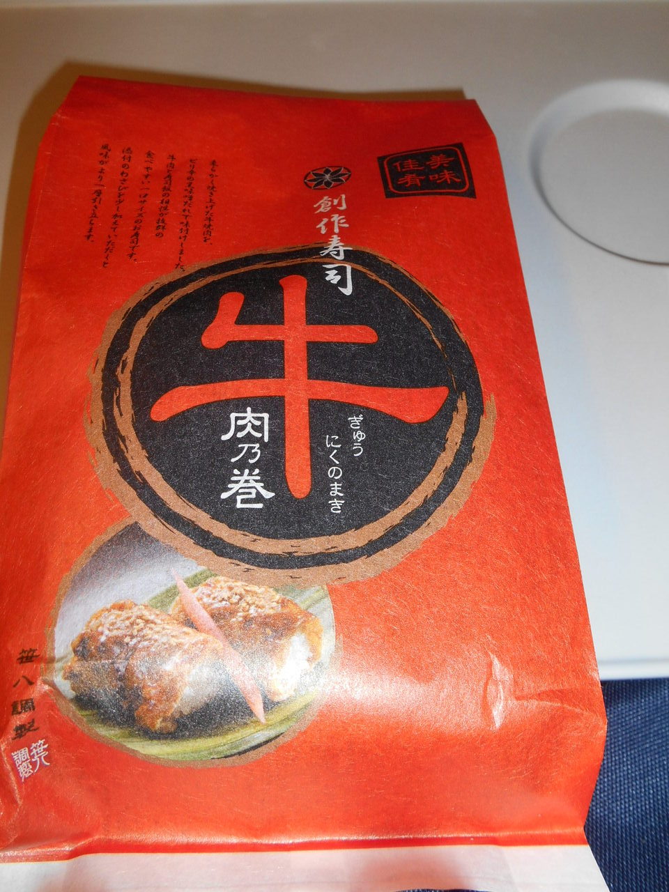 朝早く新幹線に乗る時にはこの店でおにぎりを買う事が多いのですが、今回は目先を変えて「創作寿司 牛肉乃巻を」購入。