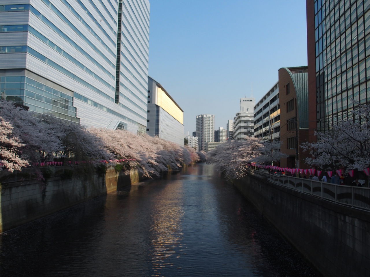 目黒川の桜並木は、東京都内でも桜の名所です。中目黒から大橋にかけてと、目黒駅界隈とで楽しむことができます。川の両岸の遊歩道で何百本もの桜を楽しむことができます。ピーク時は、前に進むのも容易でないくらい混雑します。目黒駅周辺の桜並木は周囲の高層ビルとの調和が見事です。