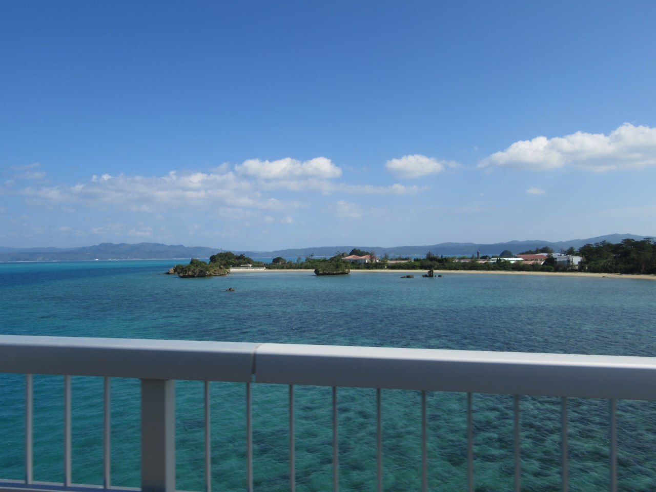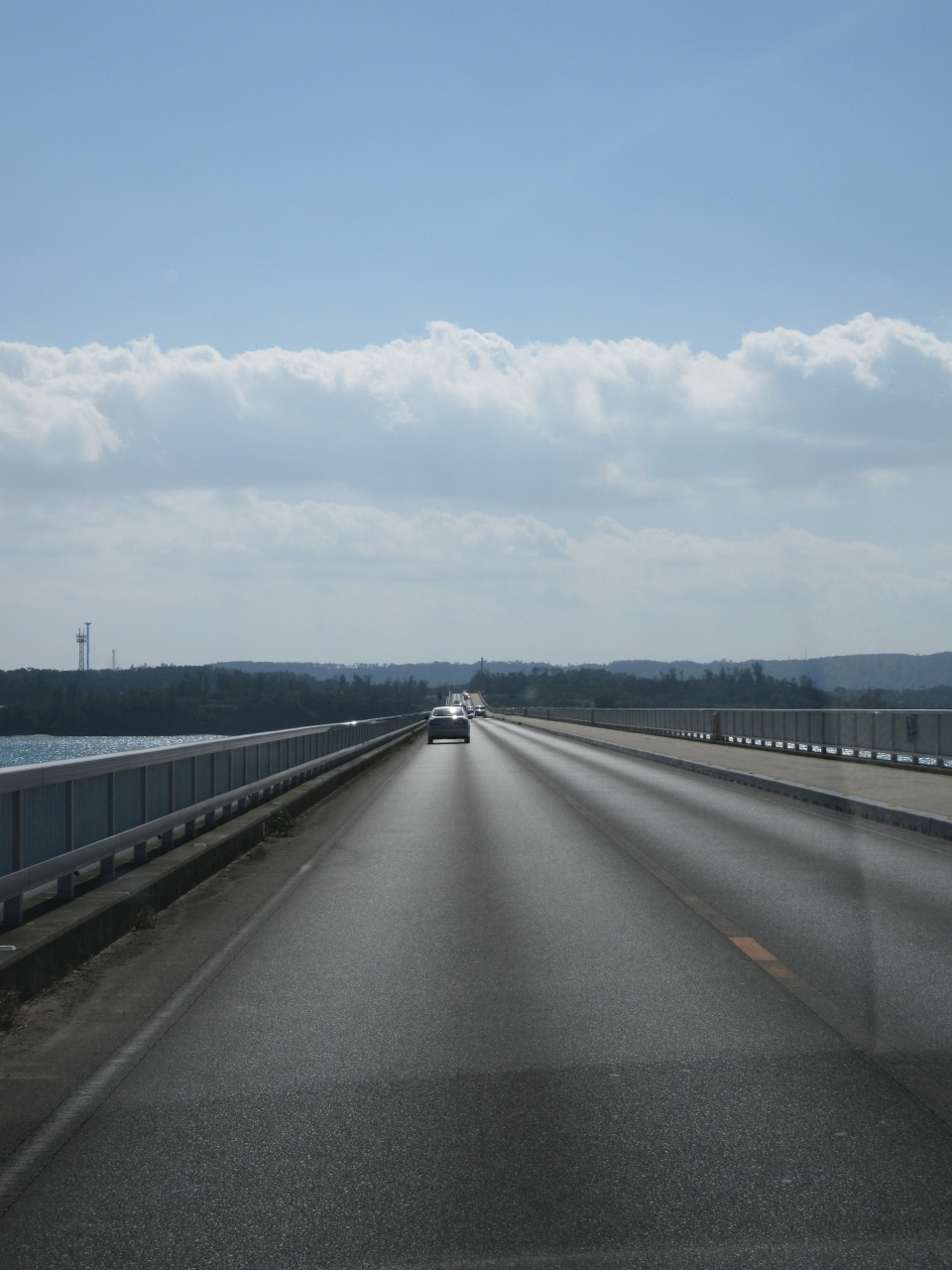 古宇利大橋を渡る前に見える真っ直ぐな橋と、