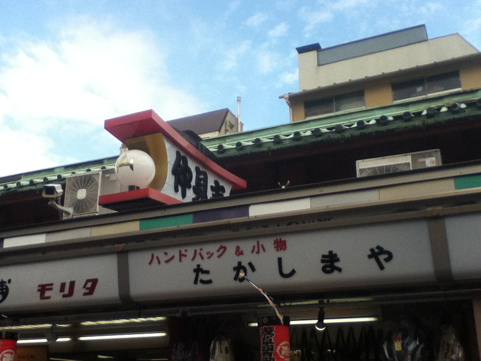 浅草の仲見世通り商店街にあるカバン屋さん。店頭には白い看板が掛けられている。数人のお客さんがいた。お勧めの点は、入口にはドアがなく付近に商品が並び入りやすいこと、店内は広くないが、レースバック、レース靴、布製バック、ソックス、レース小物などが沢山並んでいること、これらバックは素敵なデザインや色合いで丁寧に作られており特に良質のカバンを買いたい人にとっては訪問する価値があることである。