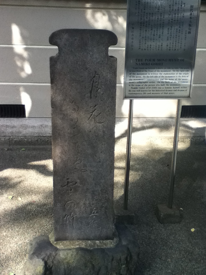 並木五瓶の句碑は浅草神社裏の駐車場にある。句碑は直方体で頭部が少し窪んでいるユニークな形状である。句碑にはやや読みにくいが、正面に「月花のたわみこころや雪の竹」、右手側面に「なにはづの五瓶、東武に狂言を出して、あまねく貴賤の眼目を驚かし、金竜の山中に雪月花の碑を築て、永く反映を仰ぐ、つづくらん百三十里雪の人普子堂大虎」と刻まれている。お勧めの点は、並木五瓶は江戸時代の歌舞伎狂言作者であること、「金門五山桐」「墨田春奴七容性」「富岡恋山開」「幡随院長兵衛」などの時代物・世話物に優れた作を書き江戸の二大作者の一人と謳われたこと、四代市川団蔵、四代松本幸四郎らによって演じられたこと、並木五瓶は有名な歌舞伎狂言作者であり特に並木五瓶や歌舞伎、狂言に関心のある人にとっては訪問する価値があることである。