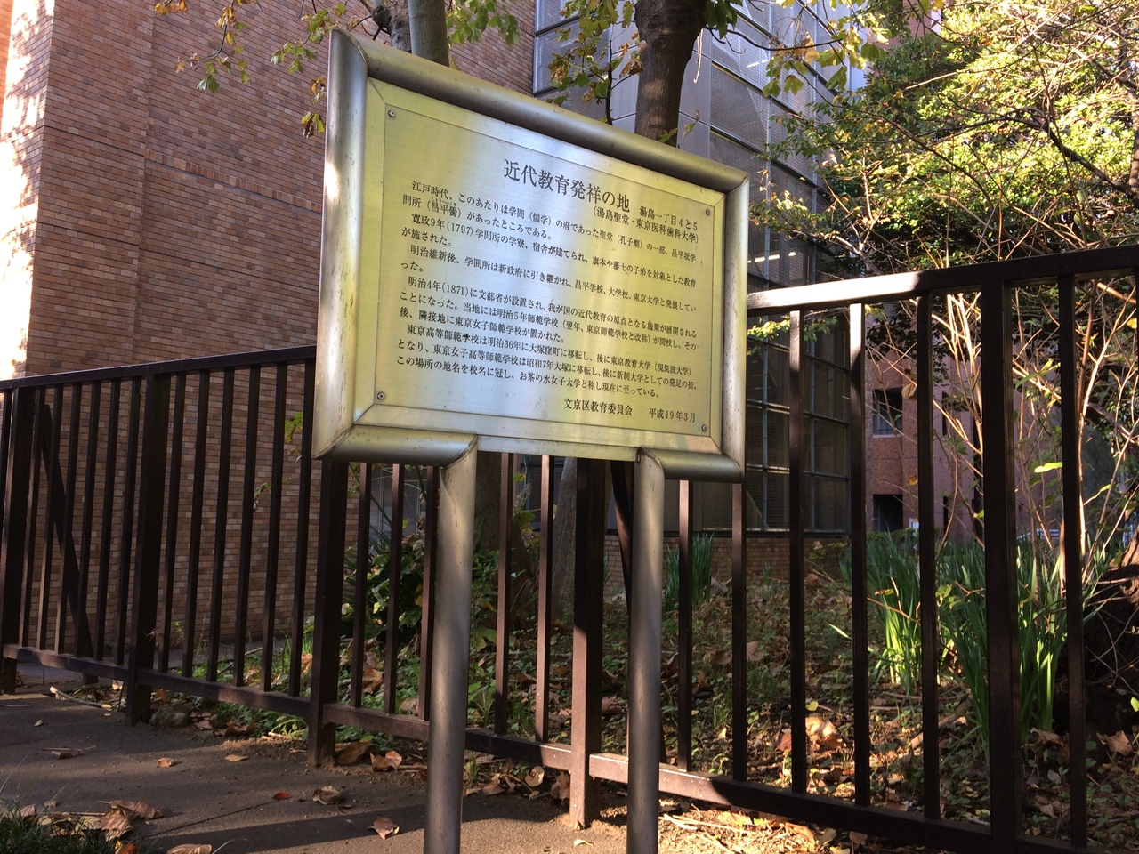 JR総武線御茶ノ水駅を降りて、聖橋を渡ったすぐの場所にあります。湯島聖堂とは通りを挟んだ場所で、江戸時代に湯島聖堂の昌平坂学問所がこの地にあり、上級武士子弟を対象に教育が施されたそうです。その運営が明治政府でも引き継がれ、東京大学や筑波大学、お茶の水大学の母体となって現在に至っているとのことです。