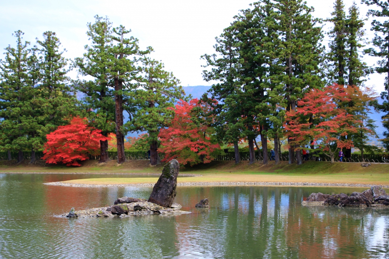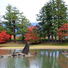 その庭園の中心は、紅葉が美しい大泉が池です。池は東西約180メートル、南北約90メートルあり、作庭当初の姿を伝えています。州浜、荒磯風の水分け、浪返しにあたる立石、枯山水風の築山といった石組みや、池に水を引き入れる遣水など見どころがたくさんありました。