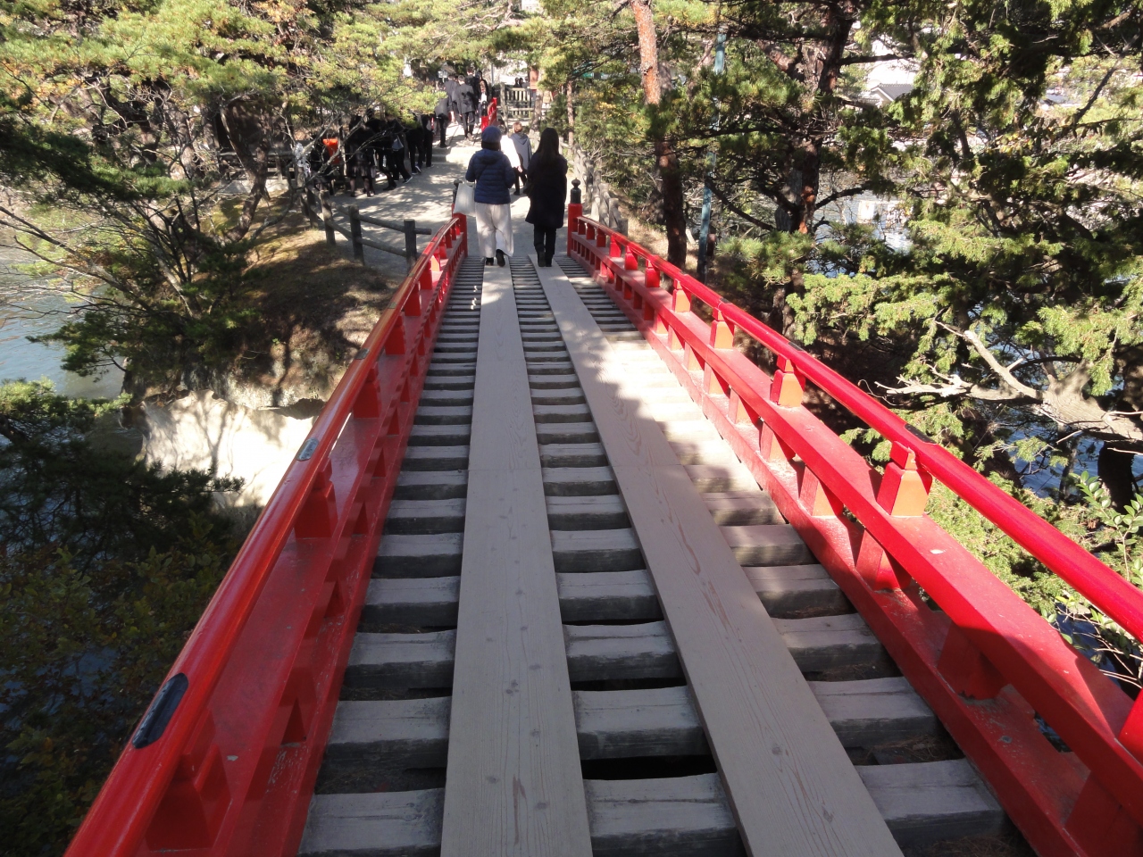 阪急トラピックスのツアーで行きました。松島で自由昼食を含め2時間あったのですが、集合まで残り20分のとき慌てて参拝に行きました。小さな島にありますが、朱塗りの橋を3つ渡ったところにあります。5分もあれば参拝はできましたが、橋が混雑しており余裕をもっての参拝をお勧めします。