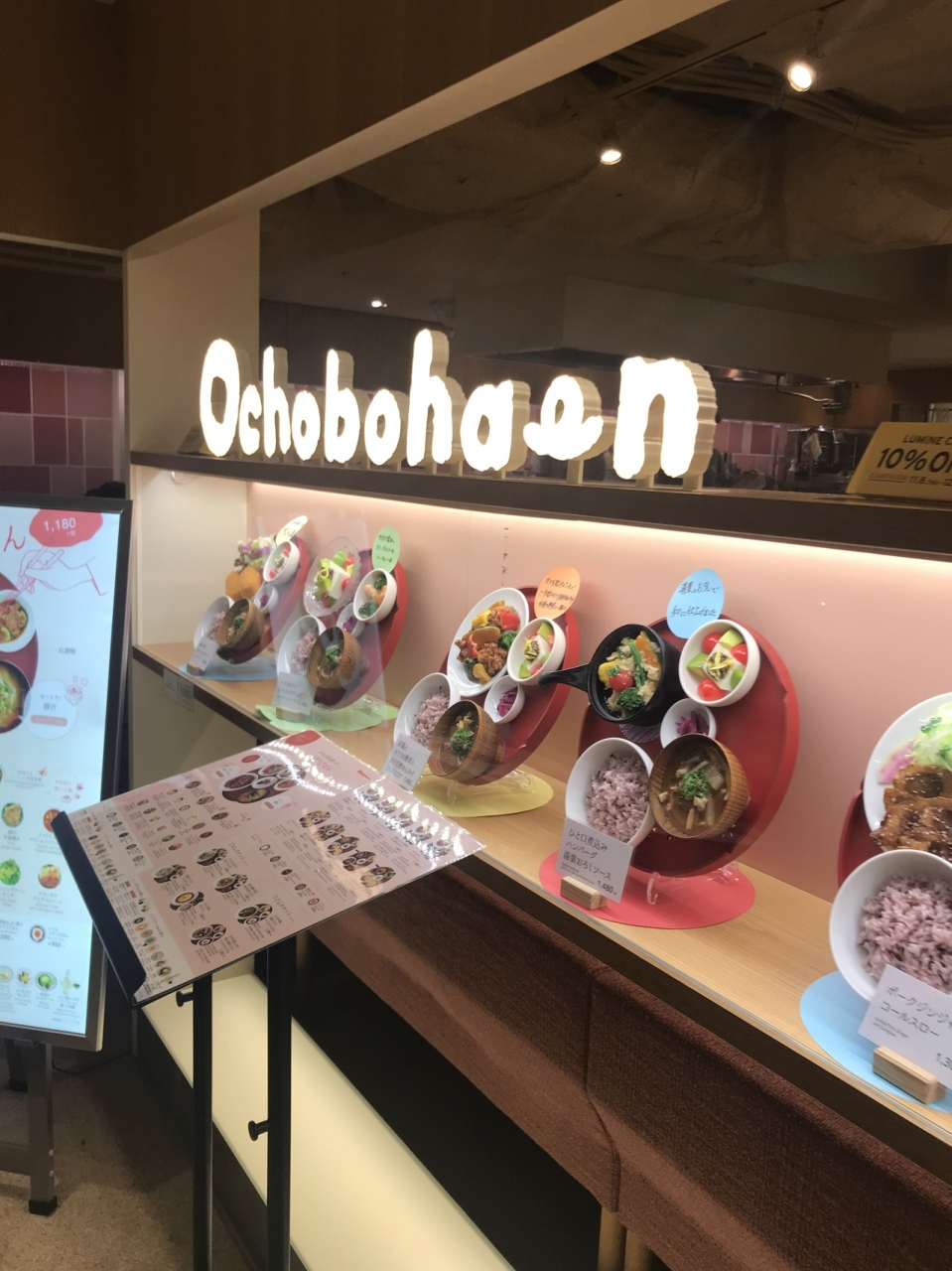 ルミネエストのレストラン街にあるおちょぼはんです。おちょぼの選べるいろどりごはんはその日の気分で小鉢が3種類選べます。もちもちの黒豆入り玄米に具沢山な豚汁がつきます。ざくぎり山芋とろろゆずこしょうなど小鉢みちま手がかかっています。