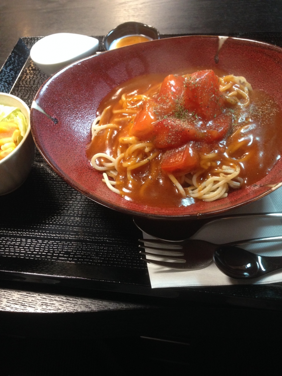 ランチのお値段は980円と少し高めですが、ボリュームあるあんかけスパゲッティとサラダ、スープ。食後にコーヒーとヨーグルトなどの和洋菓子が付くので、トータルで考えると、税込みというこもあり、リーズナブルではないかと。スパゲッティはトマトが入ってジューシーな仕上がりです