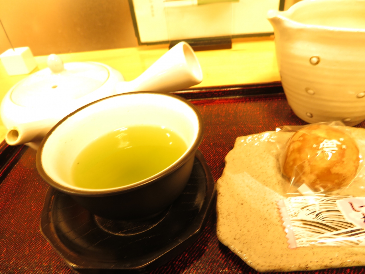 緑茶カフェはカウンター席のみでなく、奥にテーブル席もあります、緑茶と小さなお饅頭で¥500という嬉しいお値段、緑茶は急須で出てきて後からお湯を持ってきてくれます、3杯は飲めました。お勧めです。