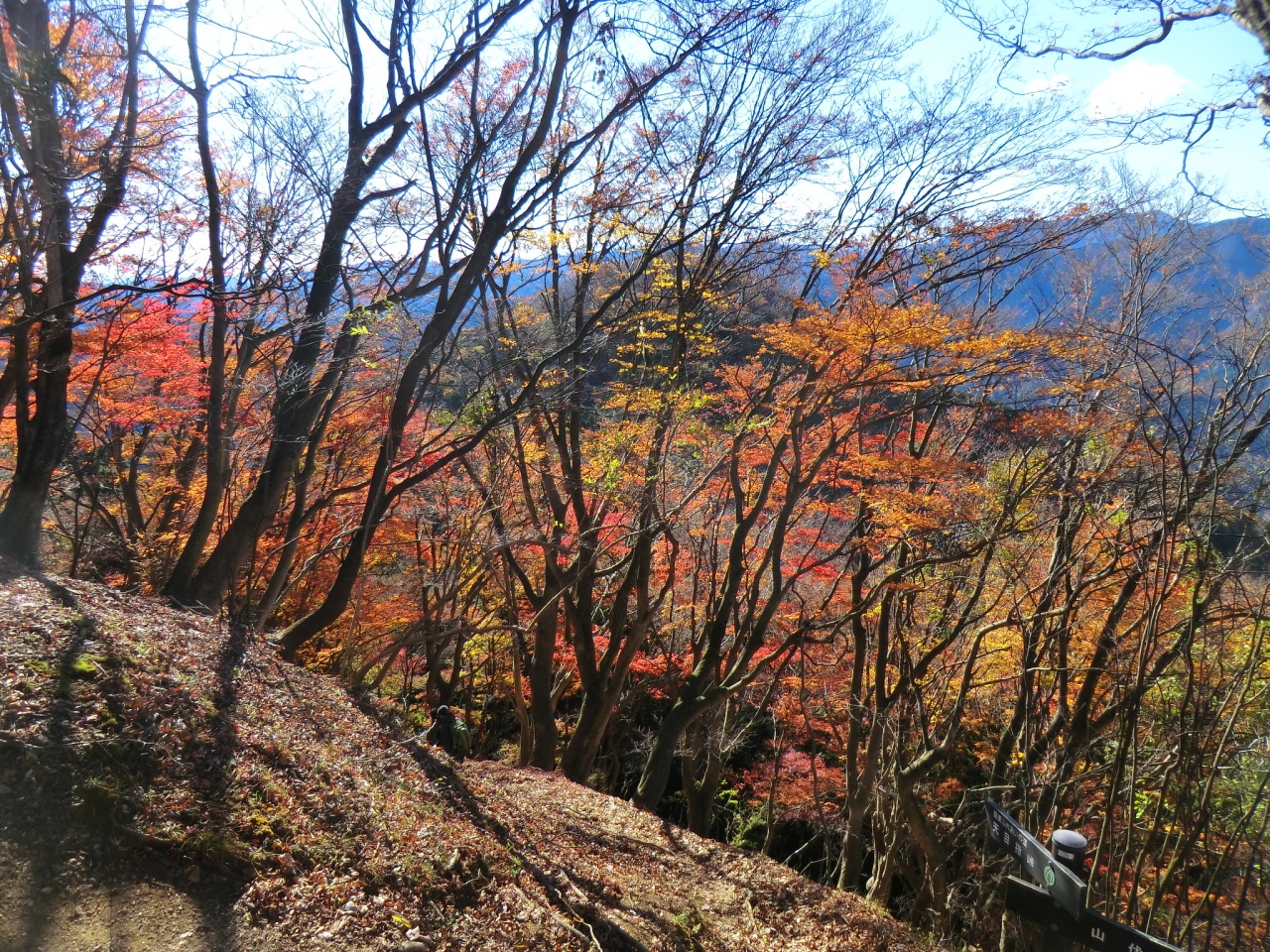 全体として針葉樹に覆われているものの、所々広葉樹もあり、新緑から紅葉そして落葉への移ろいを楽しめ、四季を通じ人気の高い山です。紅葉の時期、山頂から少し下った山伏峠分岐付近まで行くと、景色がガラッと変わります。