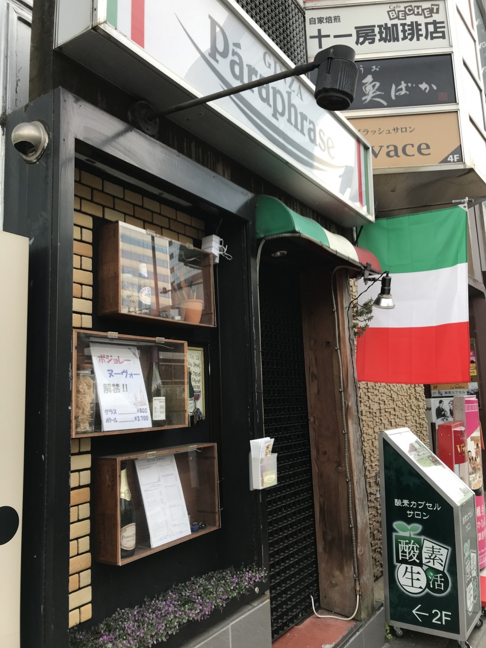 銀座一丁目のほうにあるイタリアンレストランです。テーブル席が何席かのとてもこじんまりとしたお店でした。金曜に訪れましたが、24時までやっていて遅い時間でも入れてよかったです。この時間はバータイムのようでタパスがどれも500円でした。