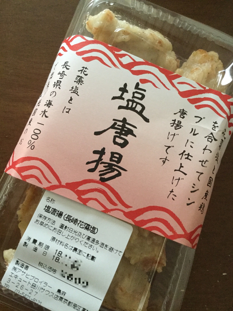 JR品川駅構内エキュートになります。旅行帰りに夕食の支度が面倒だったので、乗り換えの合間に寄りました。焼き鳥のお店ですが、塩唐揚げをチョイス。塩唐揚げは胸肉を利用していたので、ヘルシーで美味しくいただきました。