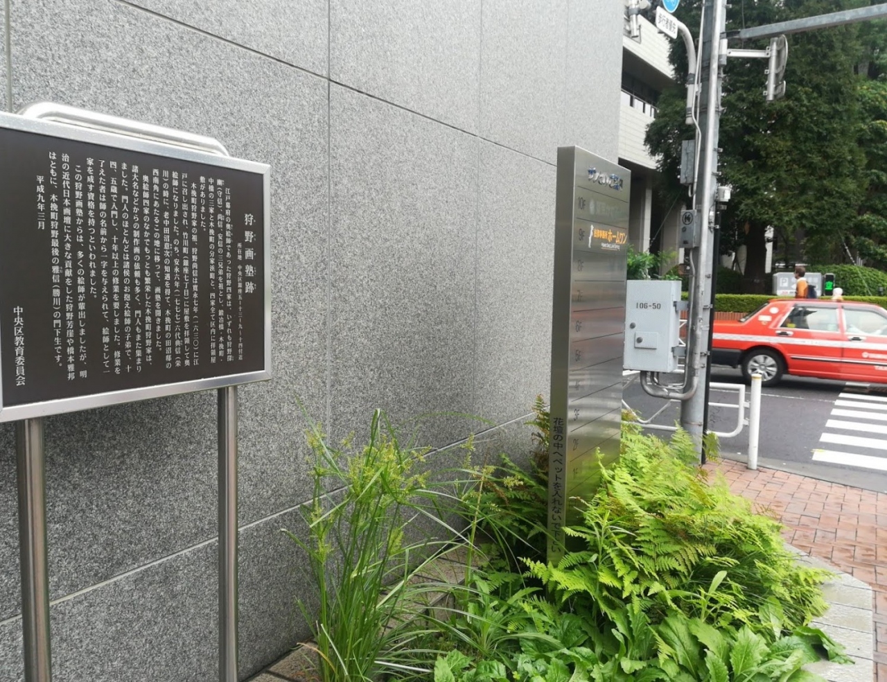 都営浅草線の東銀座駅から少し汐留方面に行ったところに説明版のみがあり、遺構などはありませんでした。このあたりに狩野四家のうち、木挽町狩野家の画塾があり、諸候のお抱え絵師の子弟が狩野派の技法を学んだそうです。