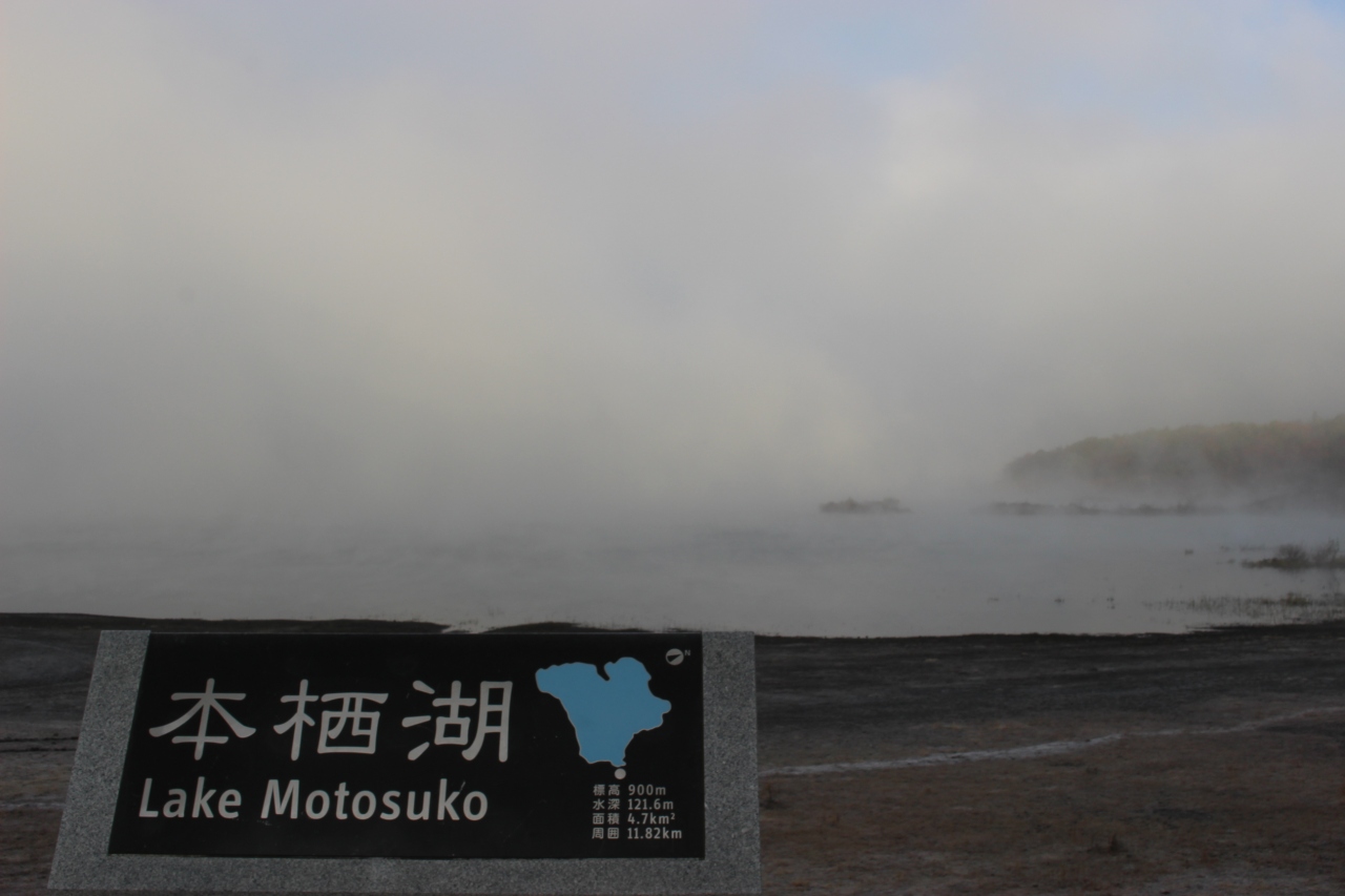 水面から湯気のような霧がたくさん出ていて、本栖湖は一面霧になっていました。