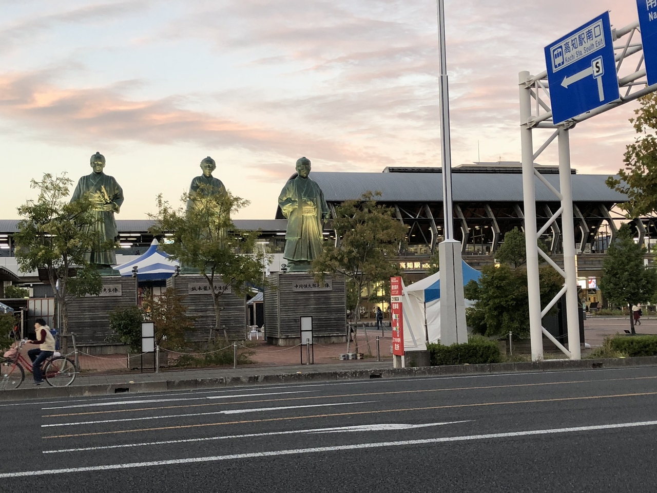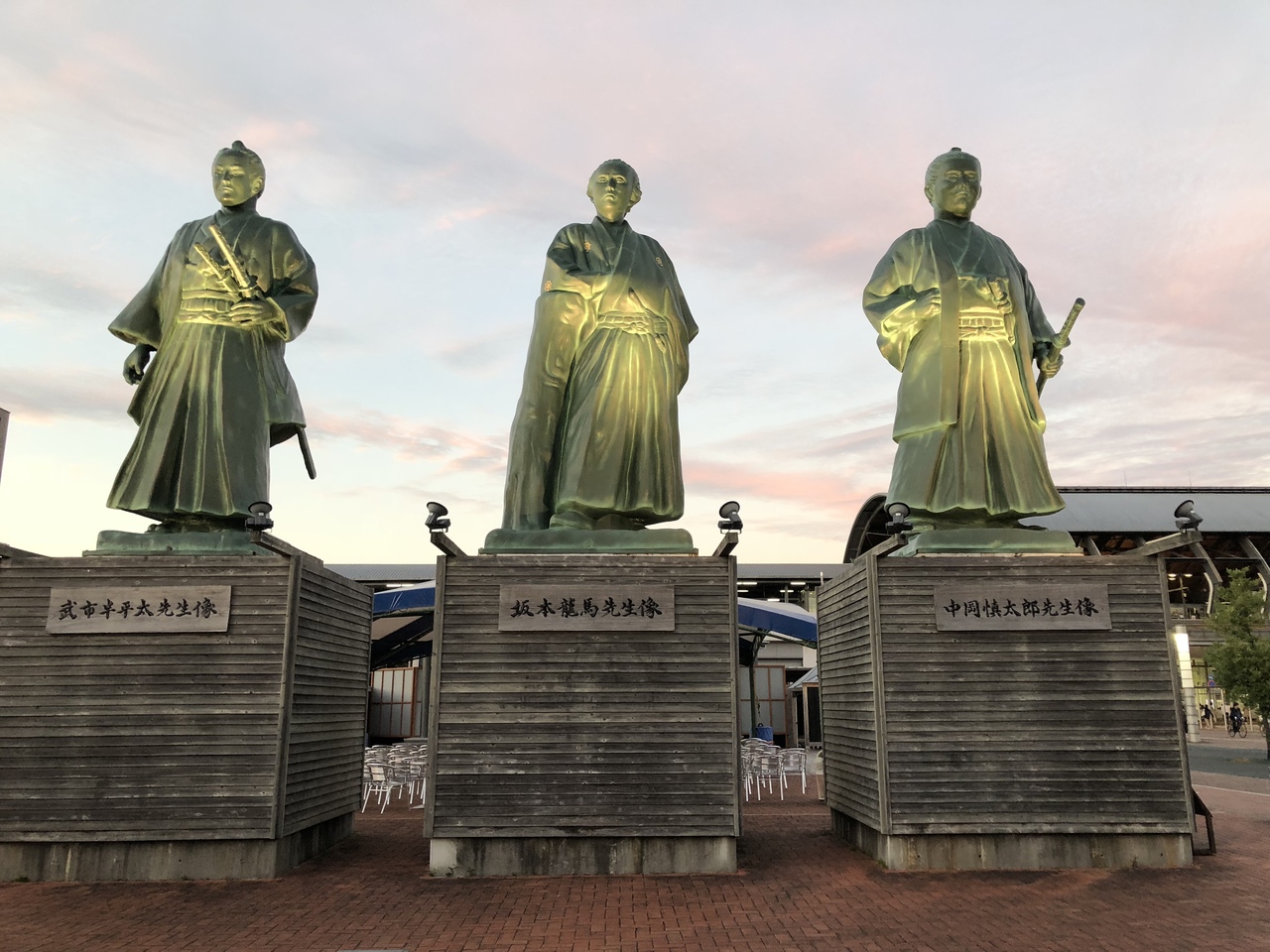 高知駅前正面左手にあって道路からよく見えます。左から武市半平太、坂本龍馬、中岡慎太郎の三志士のブロンズ像です。大きいので車で通りかかってもすぐわかります。土佐勤王党の志士ですが坂本龍馬以外は全国的に少し知名度が低いですがこの像のそばで「龍馬伝」幕末志士社中をやっているので勉強できました。