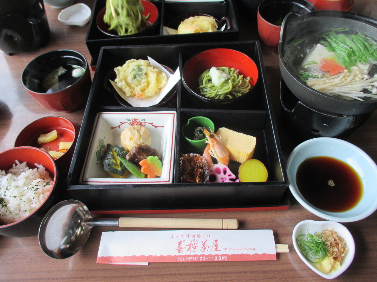 日帰りのバスツアーの昼食のために立ち寄りました。2階の食事会場からは、宇治川にかかる鮮やかな赤い橋や宇治公園がよく見えました。食事は彩りが美しく、どれから食べようか悩みました。湯豆腐やお蕎麦があり、ヘルシーな印象を受けましたが、ご飯やおつけものもあったので、意外とお腹は膨れました。