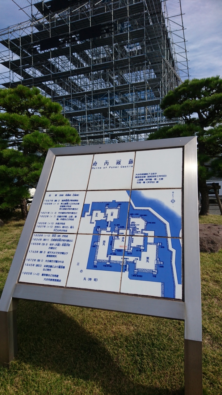 大分市の中心部から徒歩15分程度の場所にある府内城を訪れました。石田三成の妹婿福原直高12万石の居城として築かれた城で、茶の湯や能のための山里丸が特徴的な城です。天守閣はありませんが、ちょうど行った時にイルミネーションによる仮想天守を建設中でした。大きな城ではありませんが、山里丸や廊下橋など歴史的な風格を感じました。