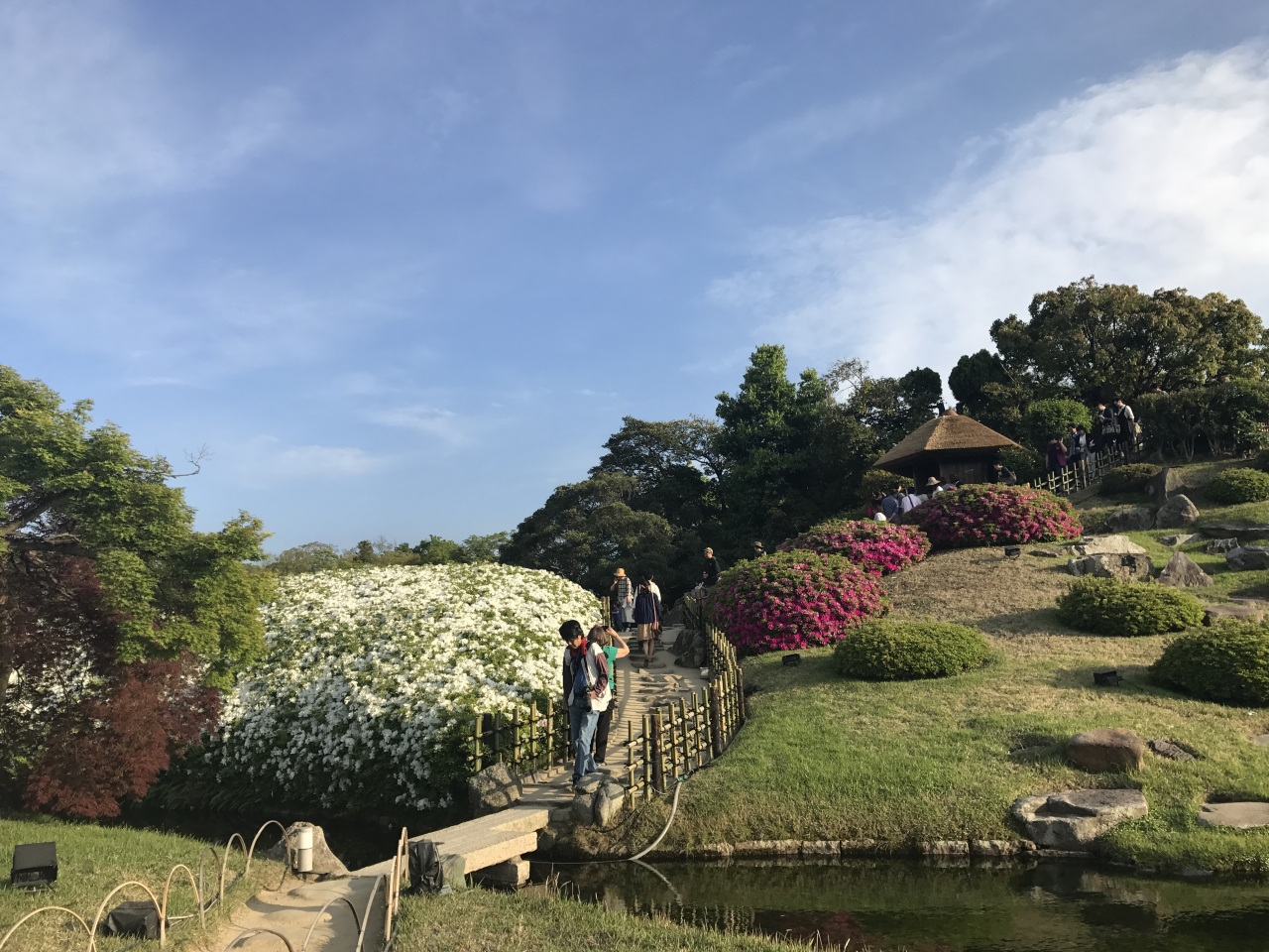 沢の池の北西の位置にある唯心山は小高い山になっていてツツジやサツキが植えられています。5月訪問で色鮮やかな景観を楽しめました。この丘ができたおかげで、立体的な景観になり、風情が増したようです。唯心山の中は道が整備されていて、色鮮やかな花の道を通ることができます。
