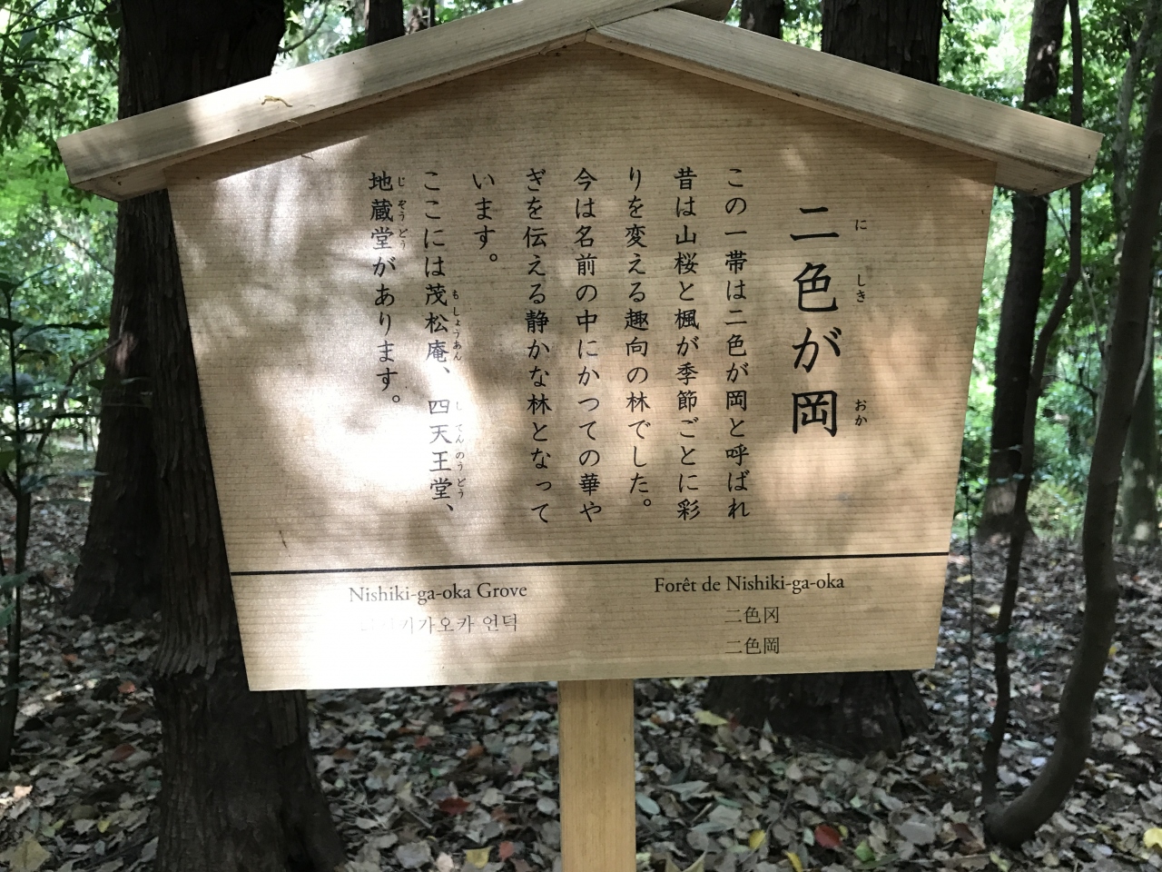 大立石を通り過ぎると、二色が岡にたどり着きました。昔は、山桜と楓が植えられていて季節ごとに変わる林を見ることができたようですが、解説版に「今は名前の中にかつての華やぎを伝える静かな林となっている」と書かれているので、山桜や楓は伐採されてしまったのでしょうか。緑が濃く、やや薄暗いうっそうとした感じの林でした。