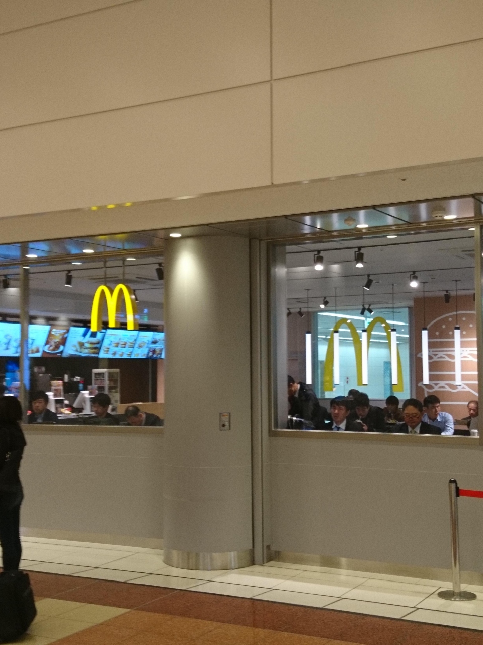 羽田空港の第二ターミナルビル(ANA側)の地下1階、東京モノレール駅改札を出た横にある空港のマクドナルド。こういった場所にもマクドがあるのは、忙しいビジネスマンの小腹を満たすには便利な存在として利用されているからである。
