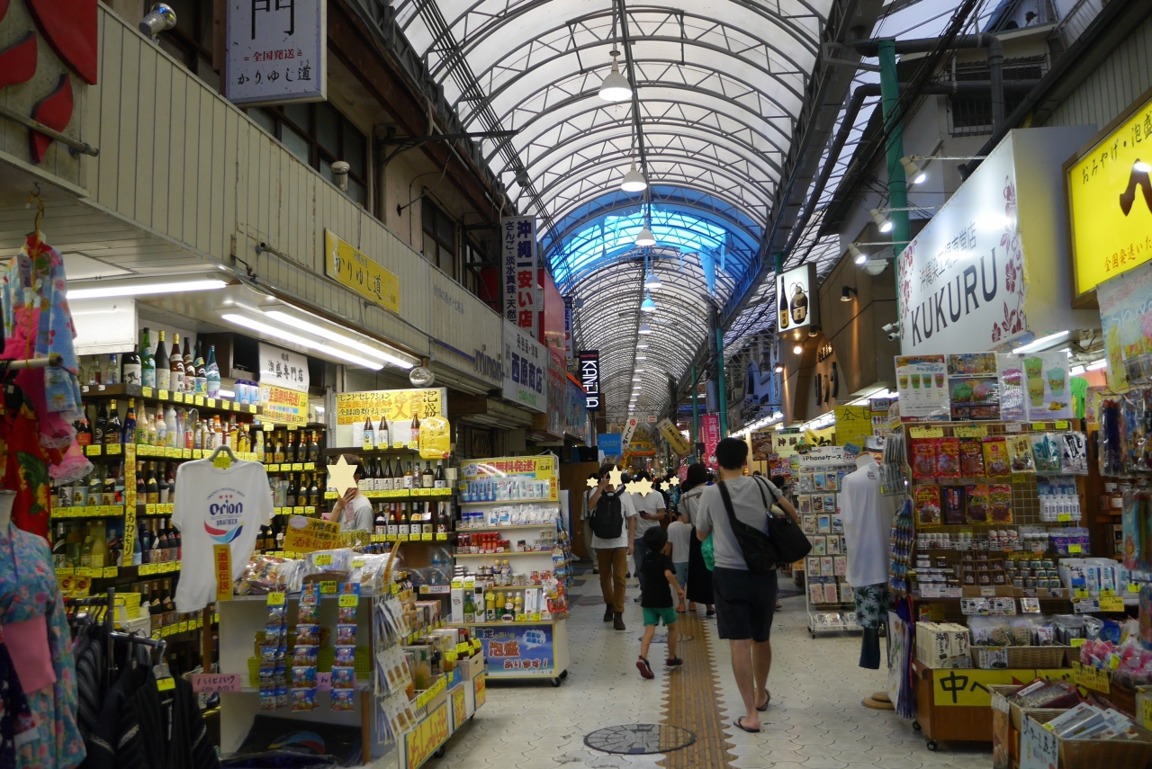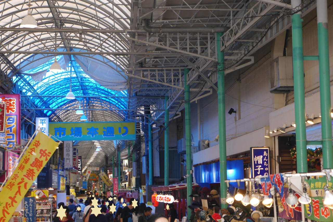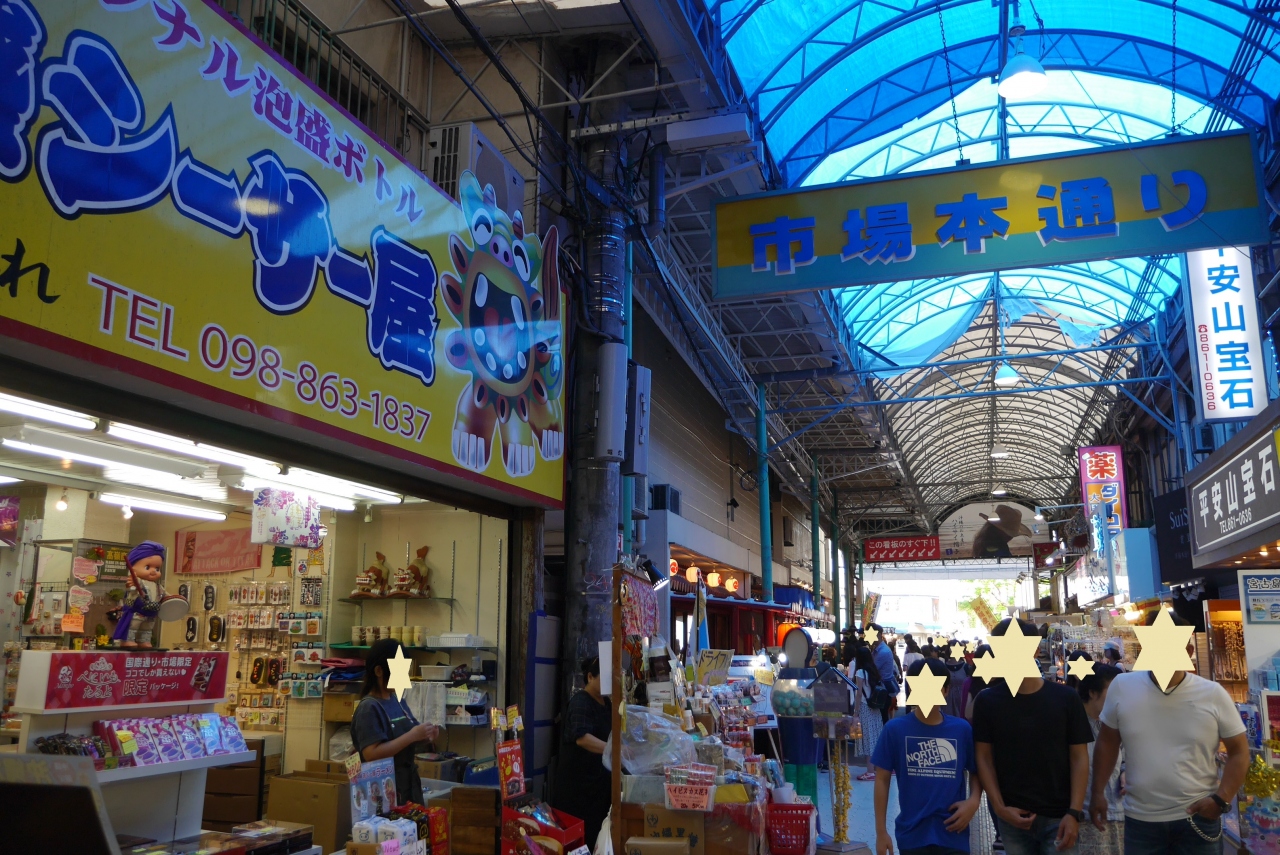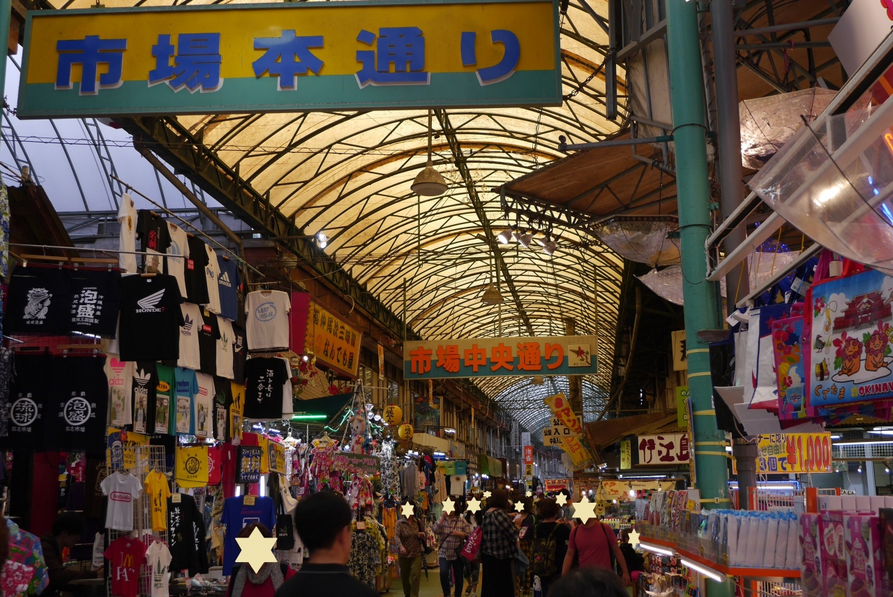 那覇の国際通りから第一牧志公設市場に続くアーケード商店街です。両側に雑貨店、食料品店、土産物店などが並び地元の人や観光客で賑わい活気があります。店先に屋台のように商品を並べているので、通りを歩くだけで商品が良く解ります。人気の食品店では行列もできていました。