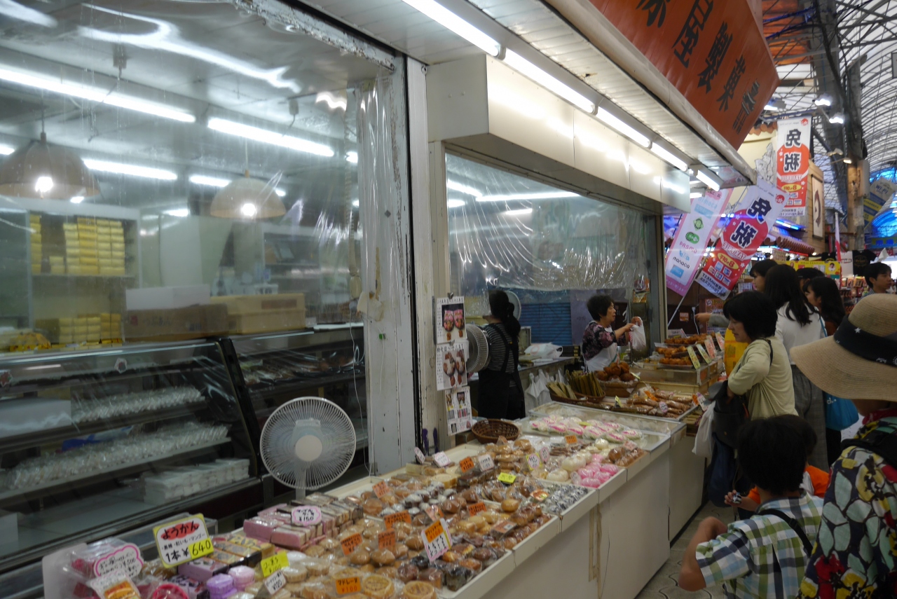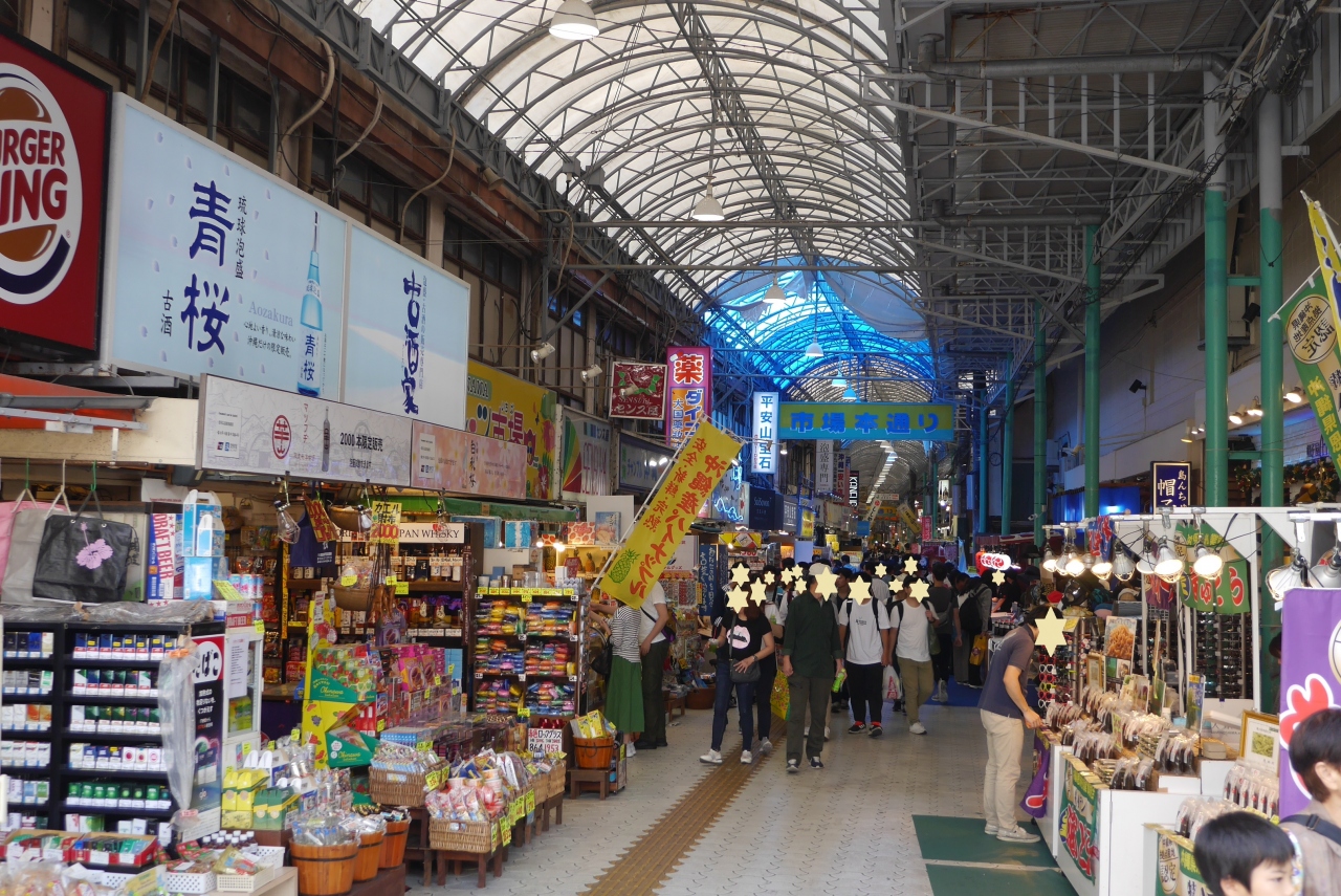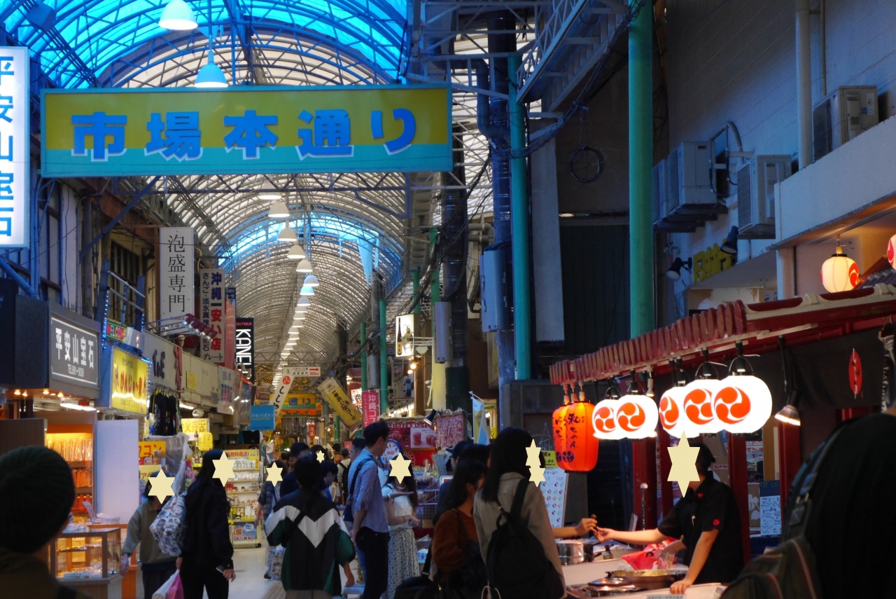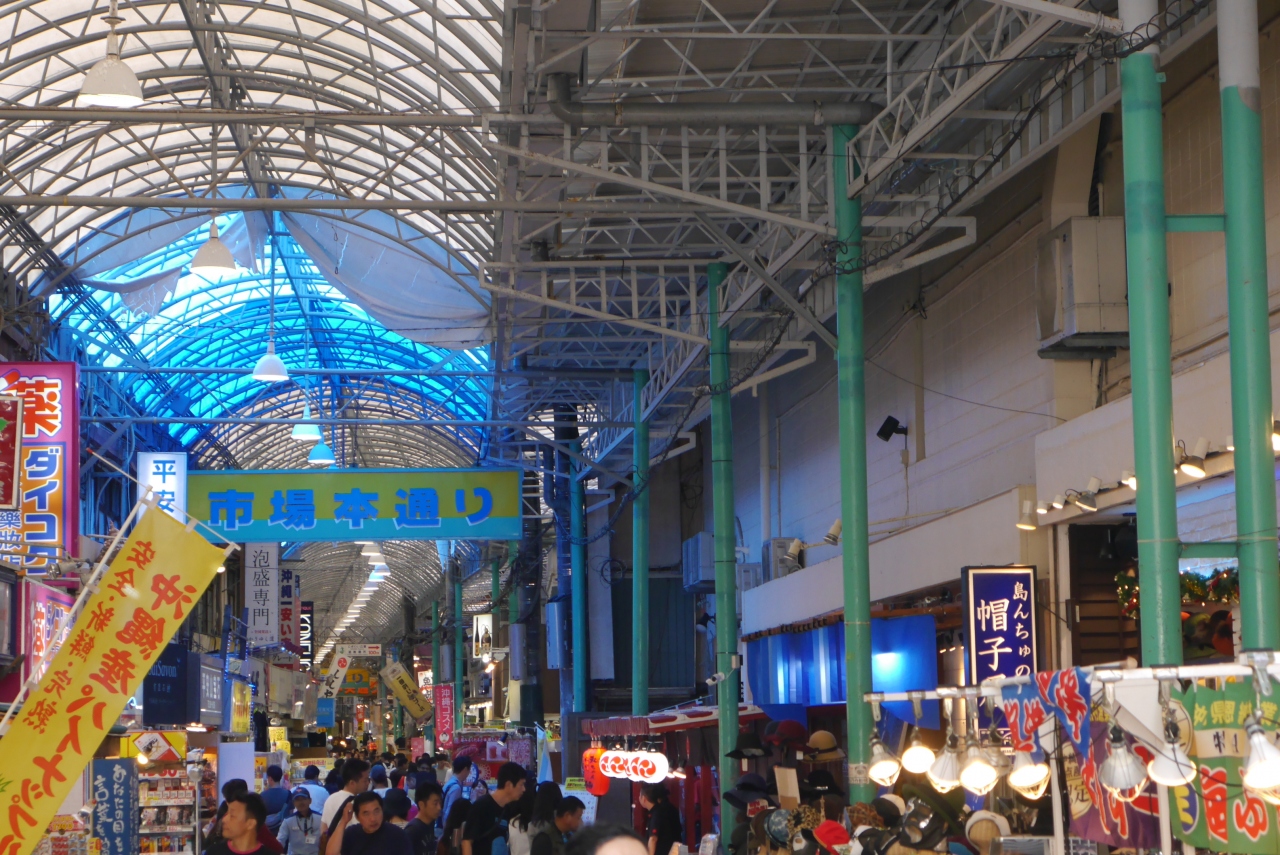 那覇の国際通りから第一牧志公設市場に続くアーケード商店街です。両側に雑貨店、食料品店、土産物店などが並び地元の人や観光客で賑わい活気があります。店先に屋台のように商品を並べているので、通りを歩くだけで商品が良く解ります。人気の食品店では行列もできていました。