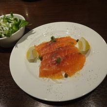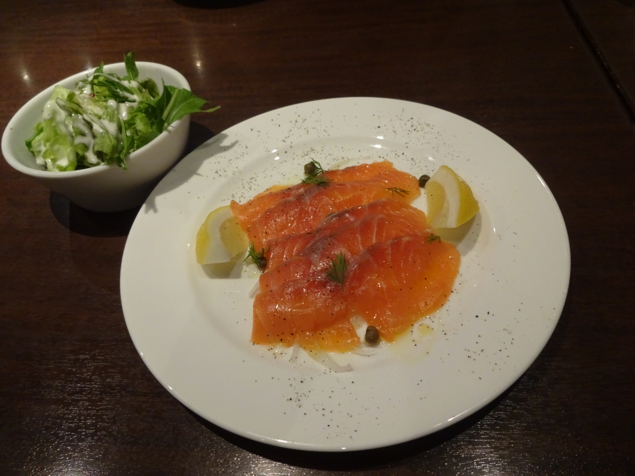 私は食欲が今ひとつだったのでサーモンとパンを頼み、それを挟んで食べた。