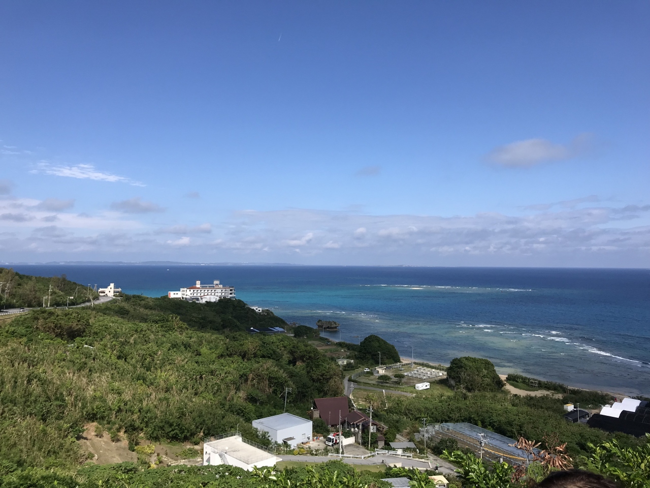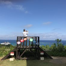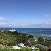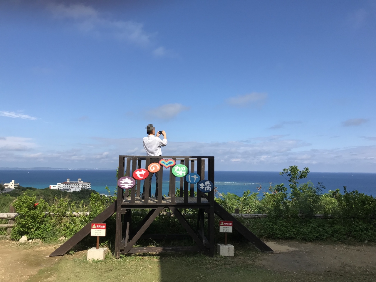 がんじゅう駅南城の裏に、「幸せの架け橋」と掲げられたちょっとした展望スペースがあります。登ってみると、久高島など、青い海が一望できる眺めの良い場所でした。