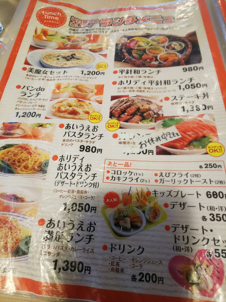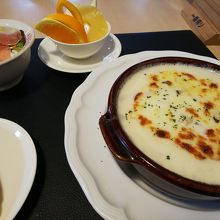 ドリアに、生ハムの乗ったミニサラダ・バゲット・フルーツそしてドリンクまでついて1,200円でした