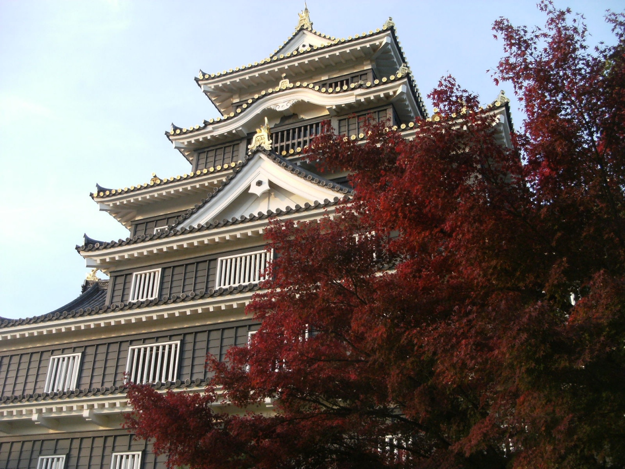 岡山城はとなりの後楽園とちがって紅葉スポットというわけではありませんが、天守閣の脇に紅葉する木があって、いい感じに彩を添えています。天守閣の屋根には金のしゃちほこが光っており、黒塗りの建物でも明るい印象を受けます。