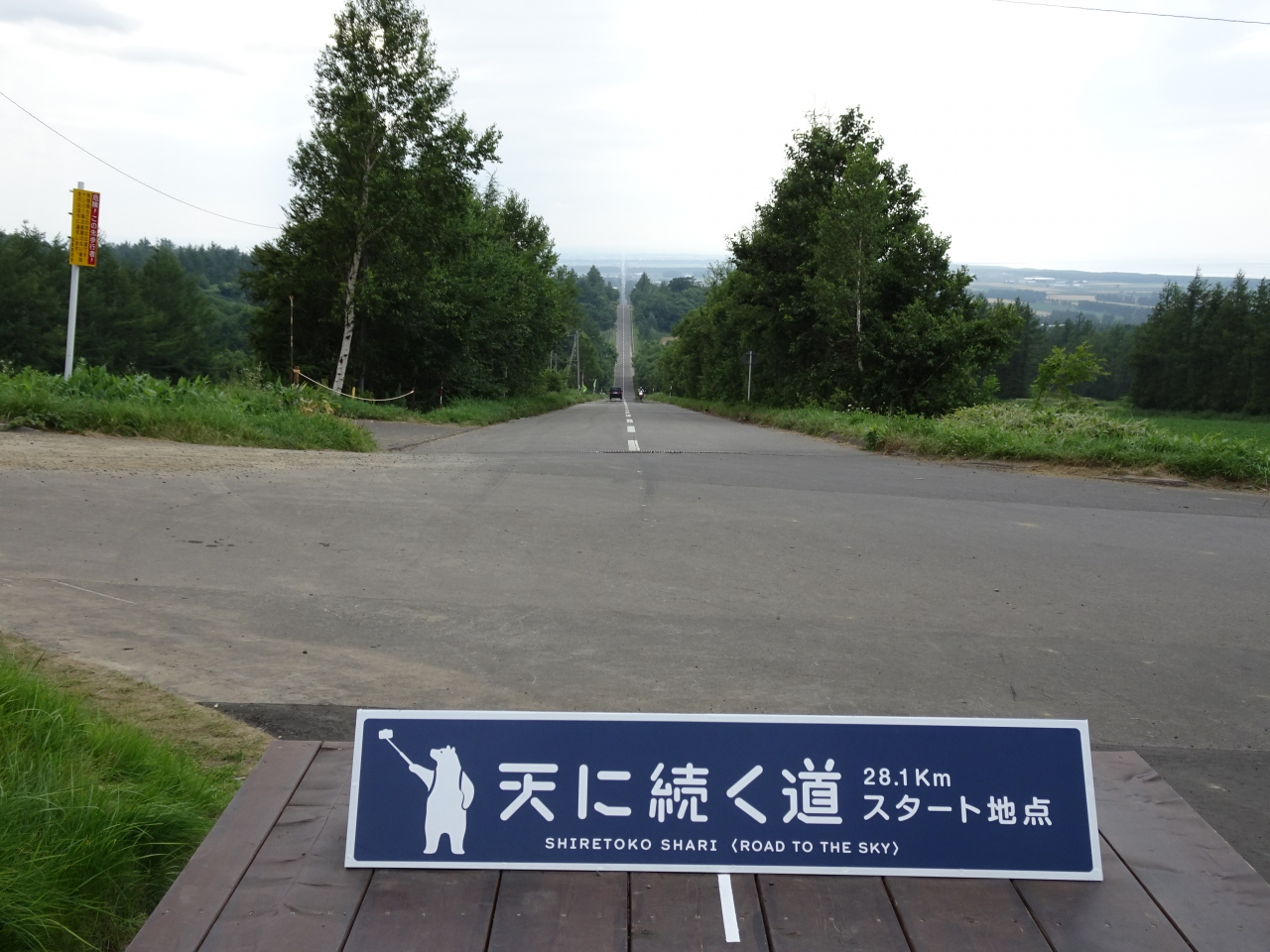 斜里町の高台から直線で28.1kmある道です。スタート地点には看板が台の上にあり、直線道路が見えます。地点の上の方に駐車場がありますが、そんなに広くありません。みなさん順番を守り、写真撮影をしていました。ウトロ方面からこちらに向かう道路も直線で、ここが天に続く道かと思ったほどきれいでしたよ。