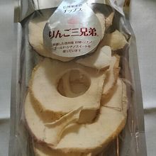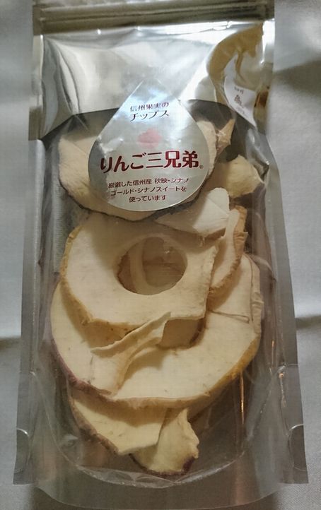 こちらのりんごをスライスして乾燥させた「りんご三兄弟」をいただきました。秋映・シナノスイート・シナノゴールドのりんごの三品種を使用しています。自然なりんごの甘さと、パリッとしながらしっとりとした食感もよく美味しく頂きました。