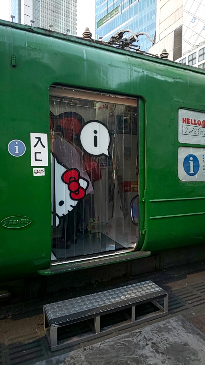 11月の休日、友達と秩父宮ラグビー場に大学ラグビーのリーグ戦を見に行きました。渋谷駅のハチ公前で待ち合わせました。ハチ公の隣に緑色の電車があります。駅前の観光案内所です。渋谷駅から横浜へ繋がる昔の東急電車を観光案内所として利用してます。
