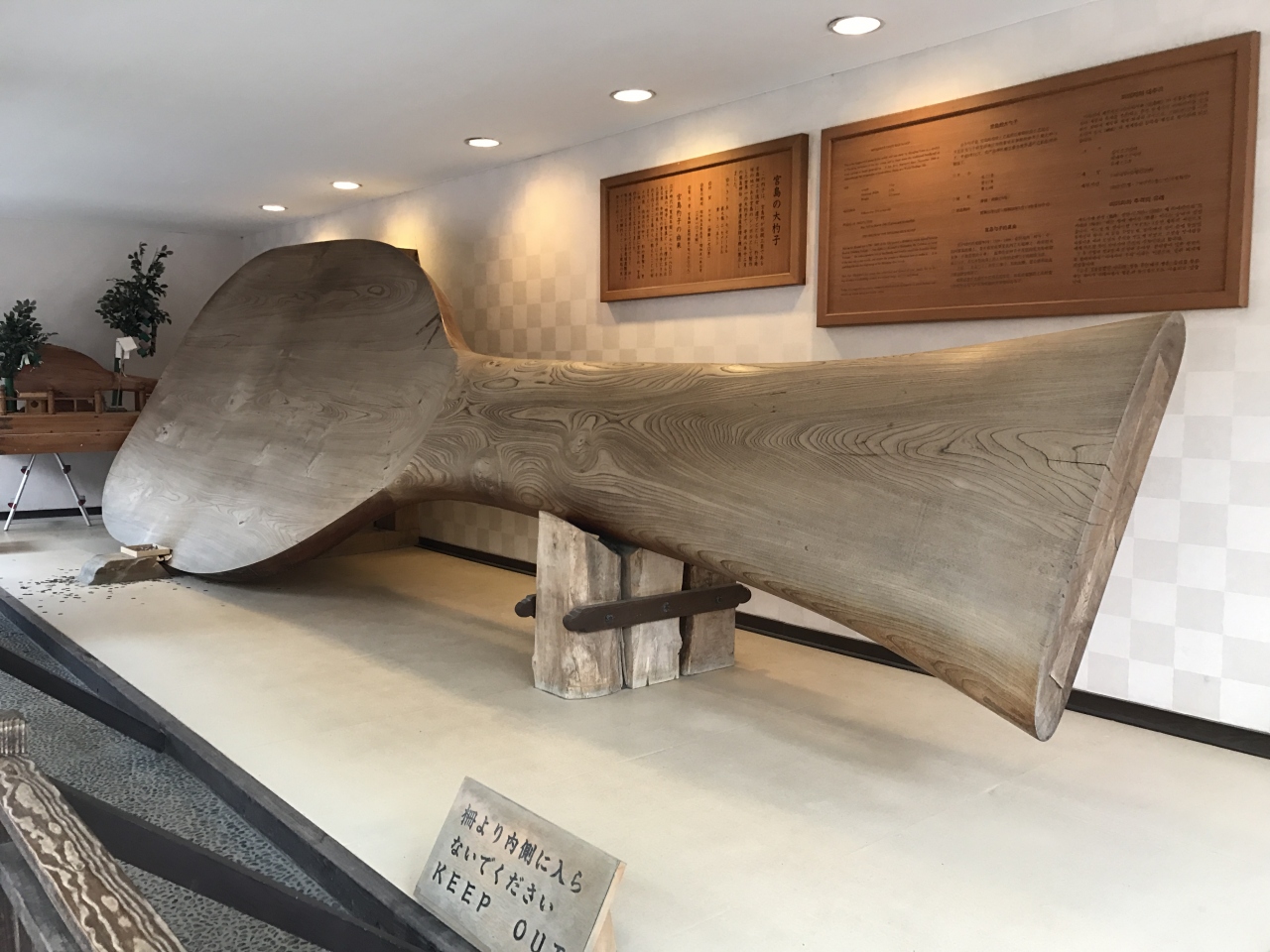 商店街の一角に大杓子を発見しました。ものすごく大きい杓子で、解説版には世界一の大杓子と書かれていました。これ、一枚板なのがすごいです。杓子は宮島の伝統工芸だそうで、確かにお土産屋さんで杓子を売っているところが多かったです。