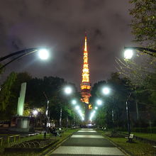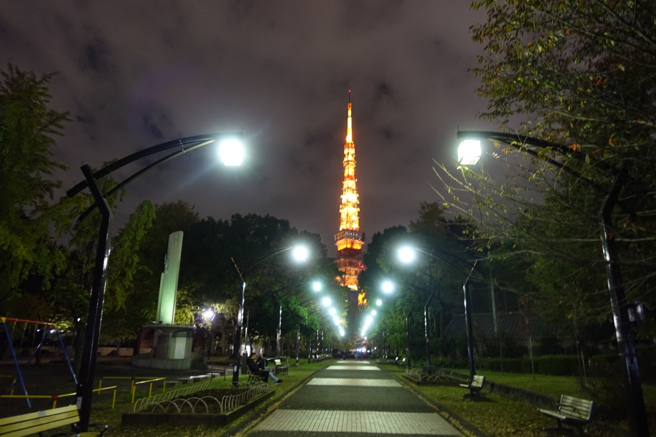 芝公園は、道路を挟んでいくつかの飛び地で構成されています。今回、御成門駅に一番近い場所から東京タワーを眺めたところ、テレビドラマなどで何度も見たことのある光景だと気づきました。東京タワーを正面に望み、その両側にはイチョウの木が並びます。今回は夜景でしたが、昼間にも是非足を運んでみたいと思いました。