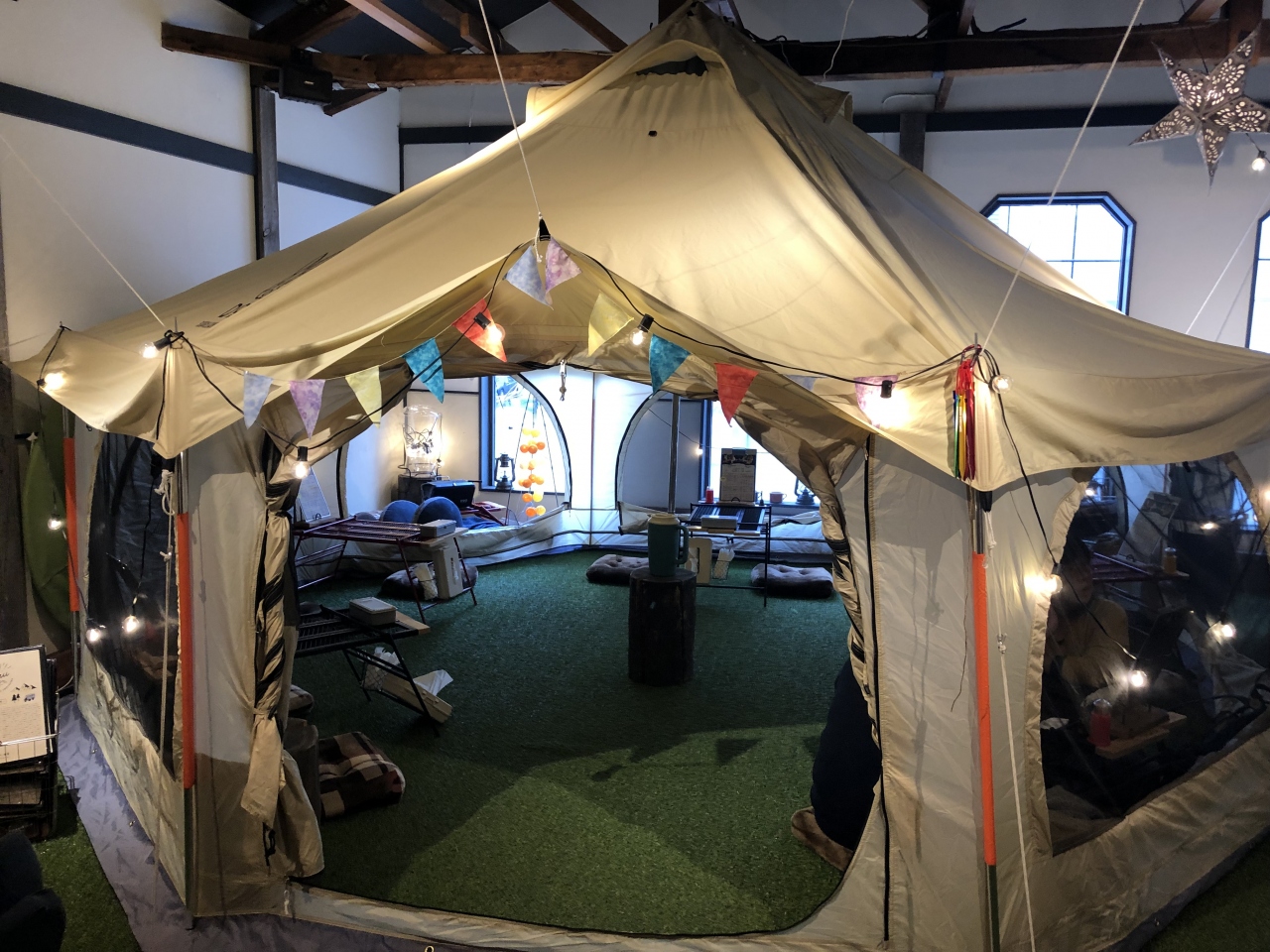 南2条西5にあります。ビルの2階です。店内はキャンプ場のようになっています。テントが張られていて、その中に席があります。人工芝が敷かれています。