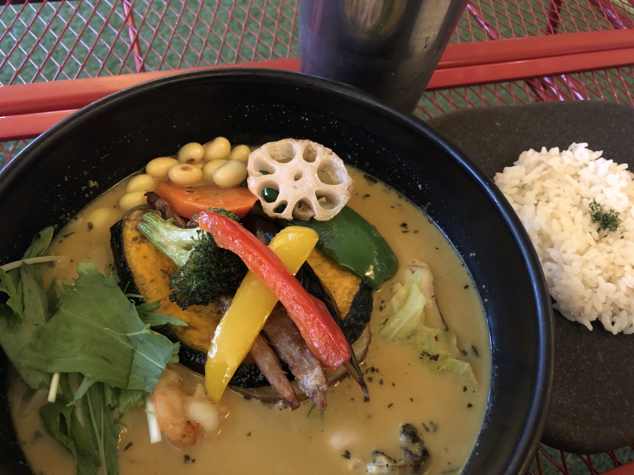 店名からイメージできませんが、スープカレーのお店です。スープ、辛さ、トッピング、ご飯の量などが選べます。(ランチタイム)