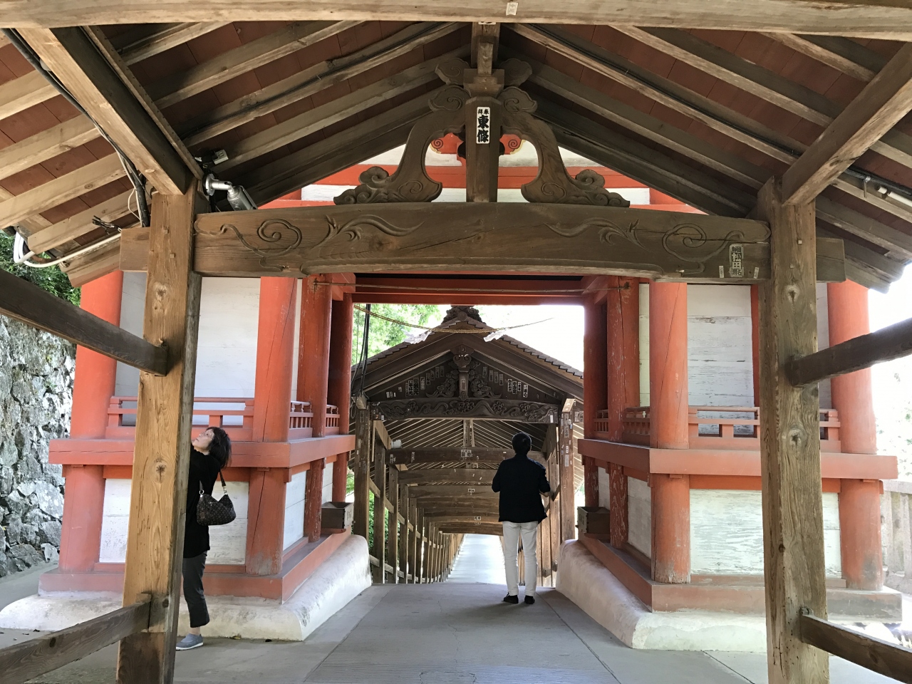 長居回廊の中腹にある随神門です。随神門といっても随神は祀られていなくて、やや殺風景な門でした。回廊と距離が近いので、随神門だけ写真を撮ろうとするのは難しいです。随神門よりさらに下って、外側から随神門のあたりを眺めると木々に覆われていて、ちょっと神秘的な雰囲気がします。