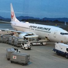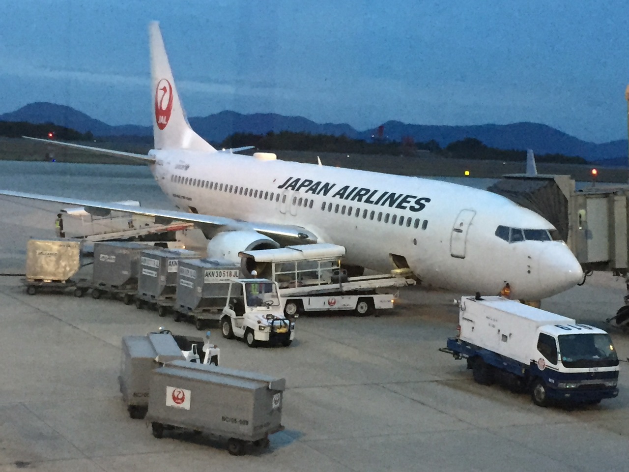 広島市内のバスターミナルからリムジンバスで55分。広島駅からだと直通で40分くらいの立地です。着陸する前に下の街並みを見ていたら、突然山に入り着陸した感じがありました。市街よりも標高が高い山を切り崩して造られたそうです。そのため、霧も多く発生するらしいですが、今回はそんなことはありませんでした。