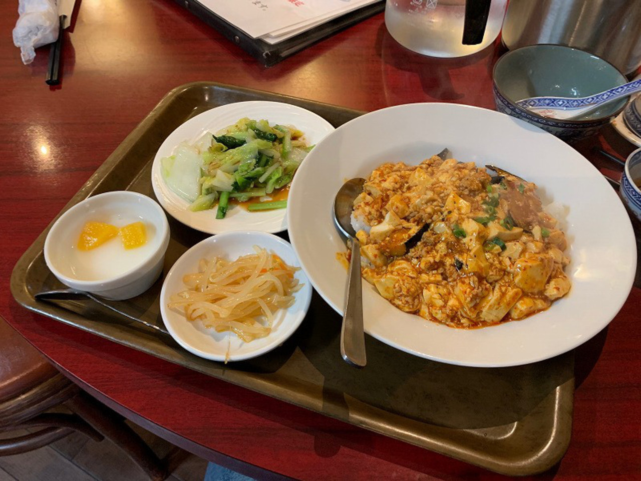 ランチタイムに訪問しました。お値段は700円からとリーズナブル。麻婆豆腐のセットをオーダー。先ずは先に熱々お粥を頂きました。