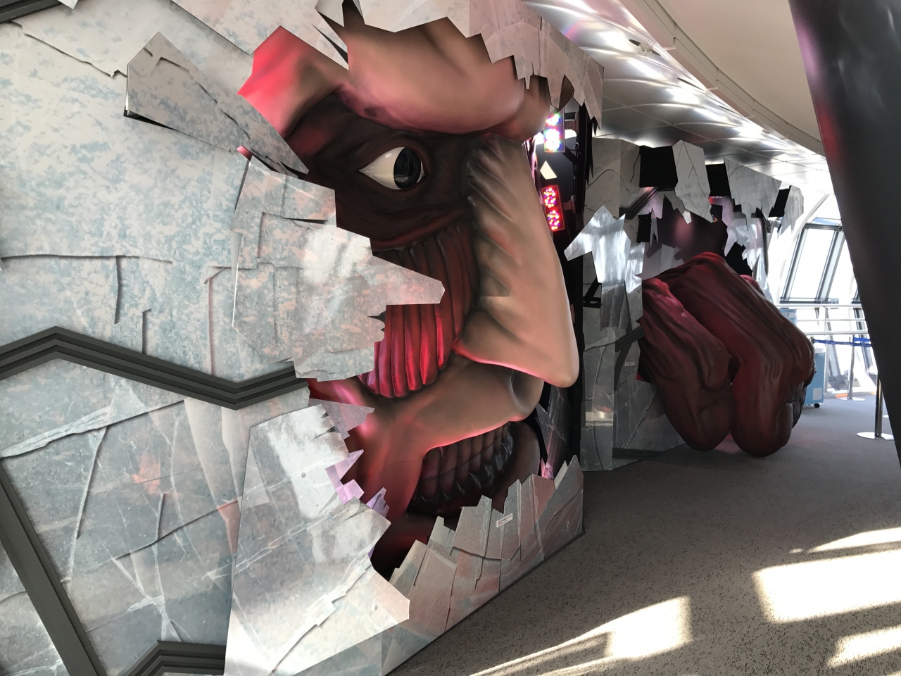 今回初めてスカイツリーの展望台部分に上りました。進撃の巨人とのコラボ展示がされていて、スタンプラリーを達成して新劇の巨人シールをもらいました。