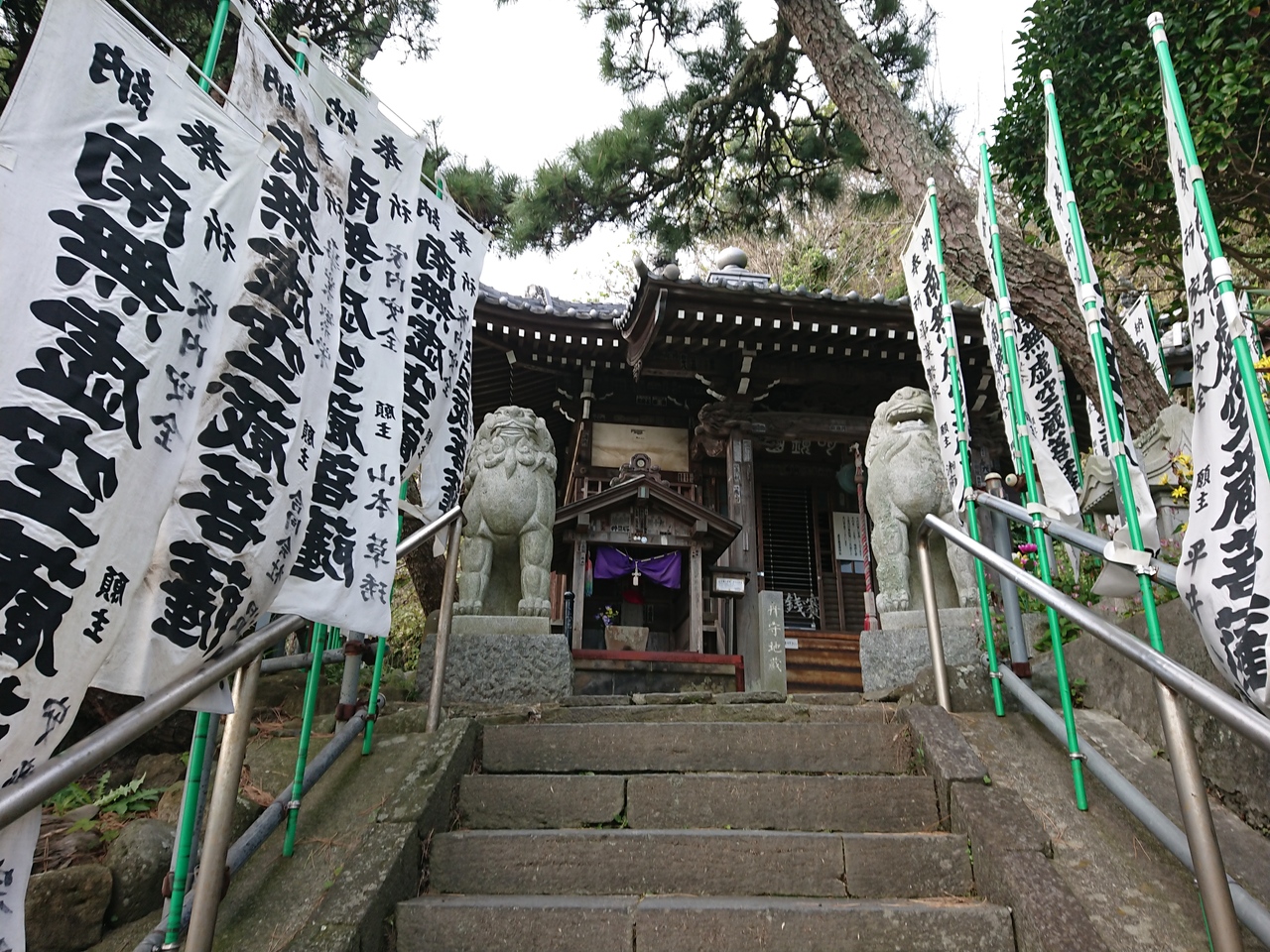 階段には真っ白な「南無阿弥陀仏」と書かれた仏旗がはためき、意外と存在感を放っていました。