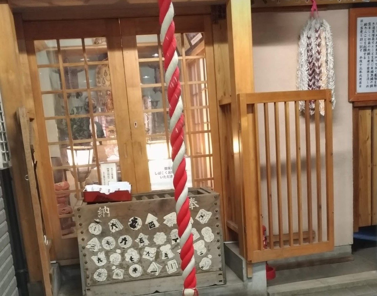 月島の駅の10番出口をあがって、もんじゃ通りの方に歩いていくと、ダイエーがありました。そのダイエーの建物の近くにここがありました。奥に入っていったところでしたが、おもしろいつくりになっていました。その場に、御守りもうっていました。