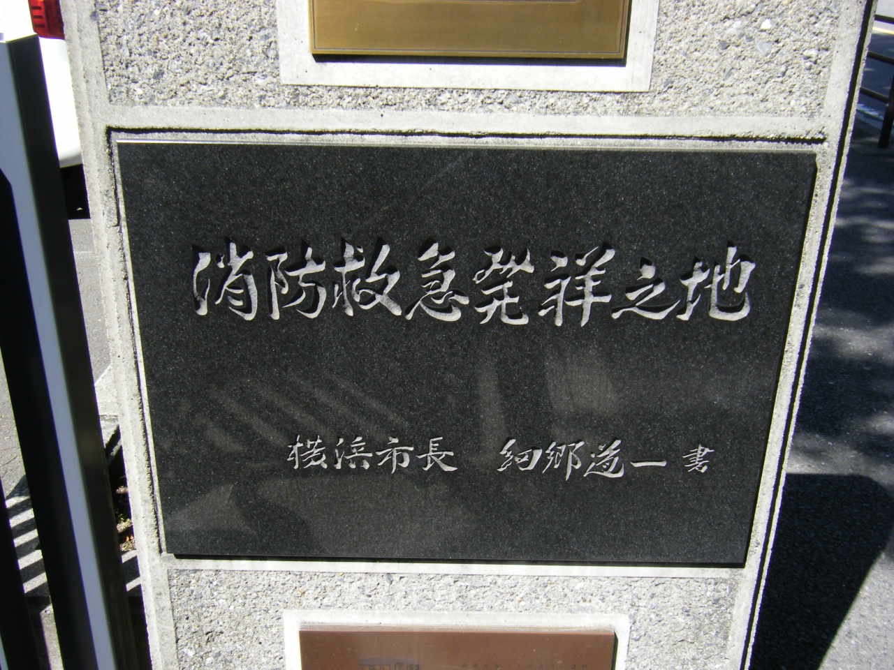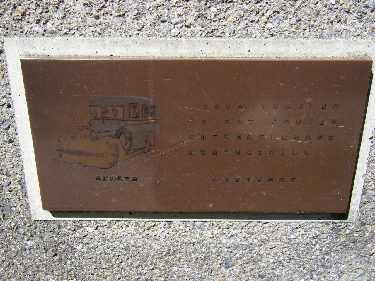 横浜ユーラシア文化館から横浜スタジアム方面に進んだ一角にあります。すぐそばには旧居留地消防隊地下貯水槽の遺構も残されており、合わせて見学することができます。こちらの史跡は1933年に日本で初めての救急車が導入されたことを残すために作られたもので、当時の救急車の姿も描かれております。案外救急車が導入されたのは年代的には遅いということに驚きを感じました。
