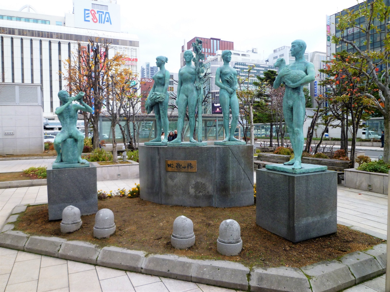札幌駅南口のイベント広場に[牧歌の像]がありました…等身大の群像で それぞれ北海道の特産を持っていました(一番左の`角笛を吹く`男性;角笛は? 本州ではほら貝?)。天気は晴でしたが気温は,,。。見るからに`寒そう`で駅の外に展示されると彫刻家に言ったのかしら,,。ブラッセルの像みたいに着物を,,(^^)