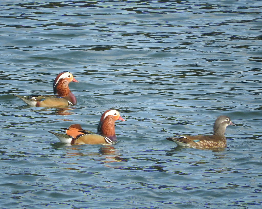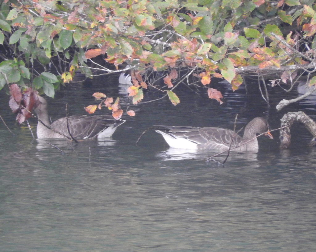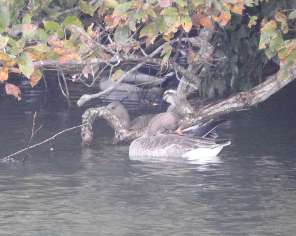 水郷県民の森の大膳池には、毎年、冬になるとオシドリの群れが入りますが、今年は更に珍客のマガンが2羽入っていました。