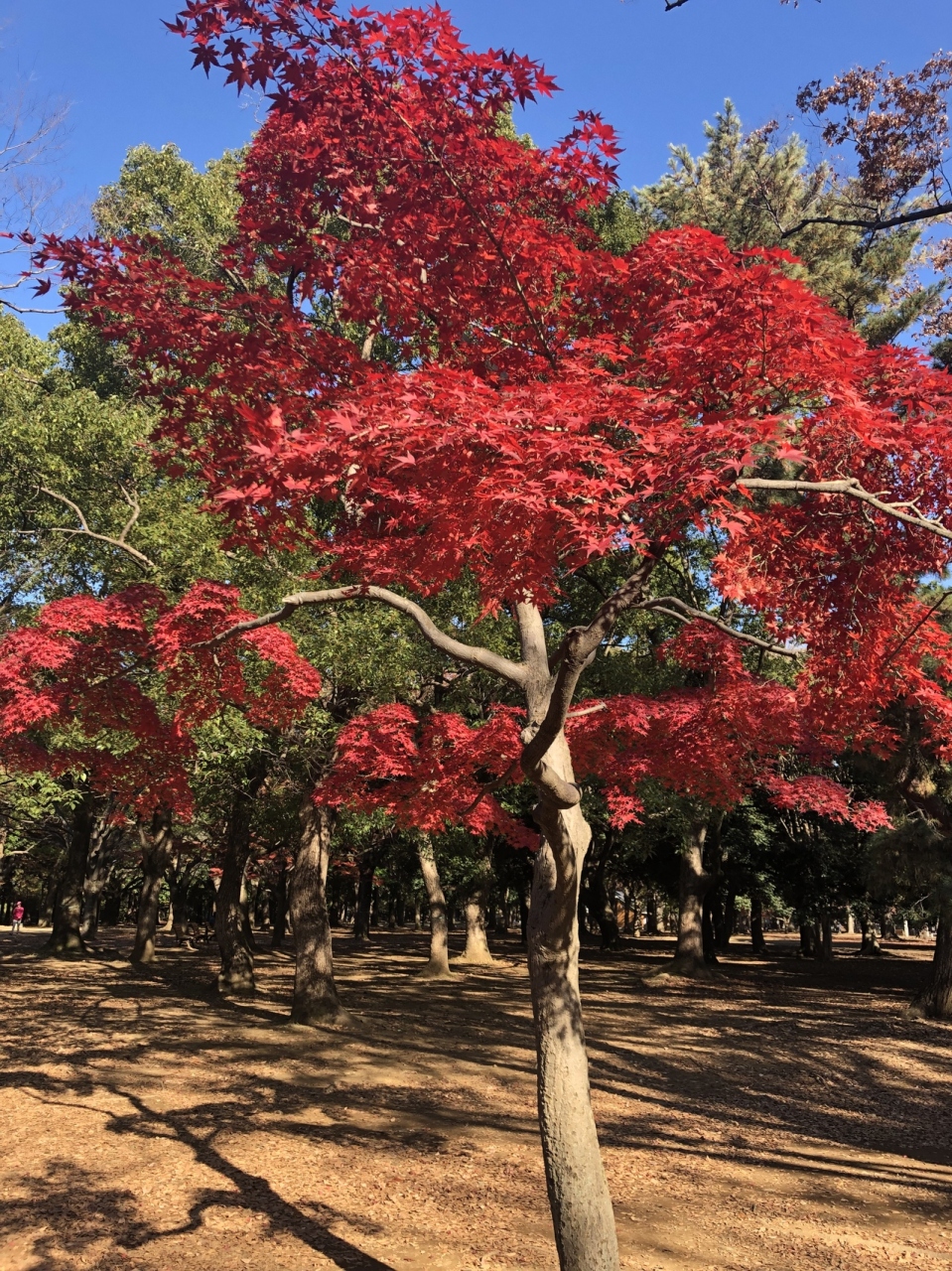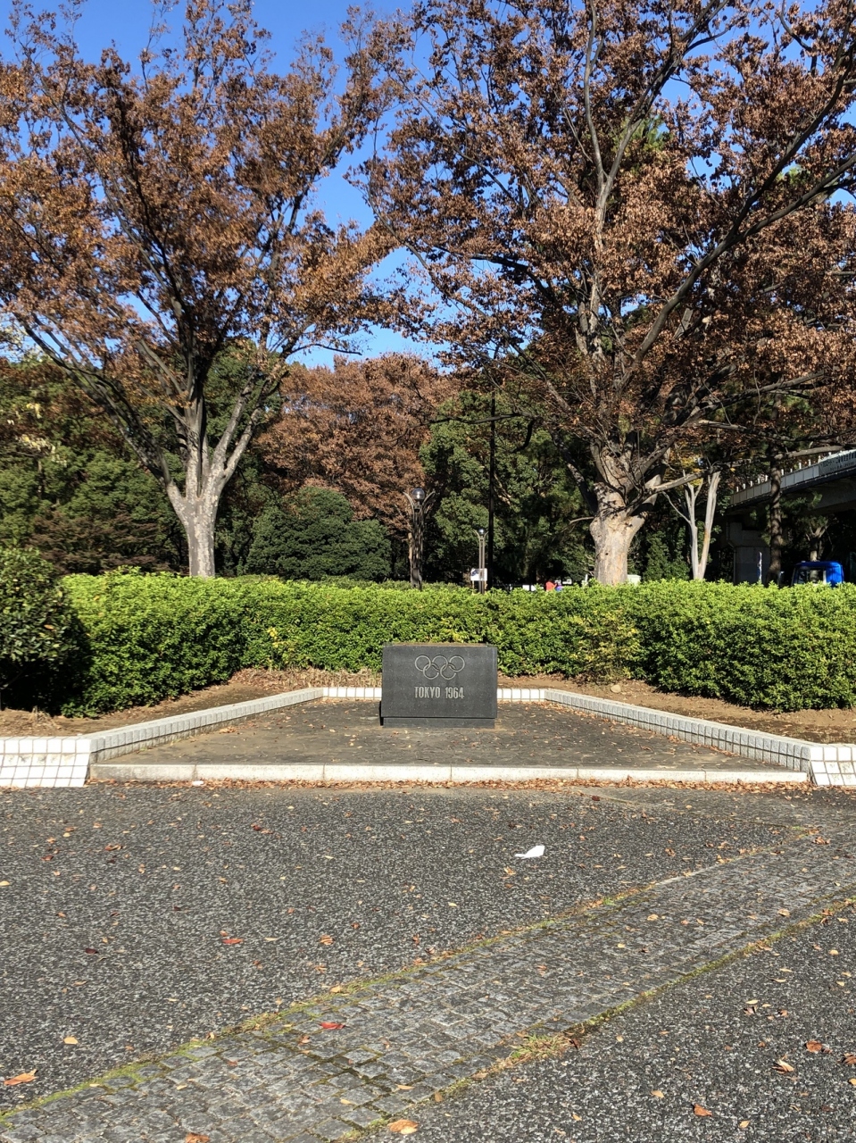 モンブランスタイルで整理券をゲットし、365日でパン購入、15℃で朝食を食べた後に行きました。公園内には、1964年の東京オリンピックの記念碑がありました。また、赤くて綺麗な紅葉の木が1本あったのが印象的でした。しかし、カラスがとても多いので、公園での食事はしない方がよいと思いました。
