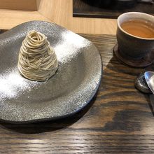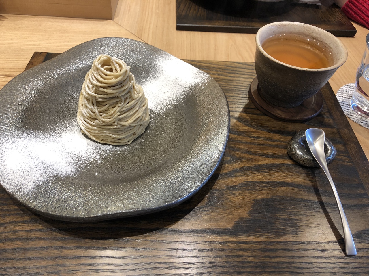 7:50頃に並んでから30分くらいして整理券が配られました。時間は13:20で、指定時間の10分前までに戻るように言われました。13:10頃に到着したら、5分くらいで入れました。メニューはモンブランとモンブランパフェの2種類で、モンブランとほうじ茶のセットをオーダーしました。栗の風味を生かすため、クリームも含めて甘さ控え目でしたが、とても美味しく、いい栗を使っているのがわかりました。