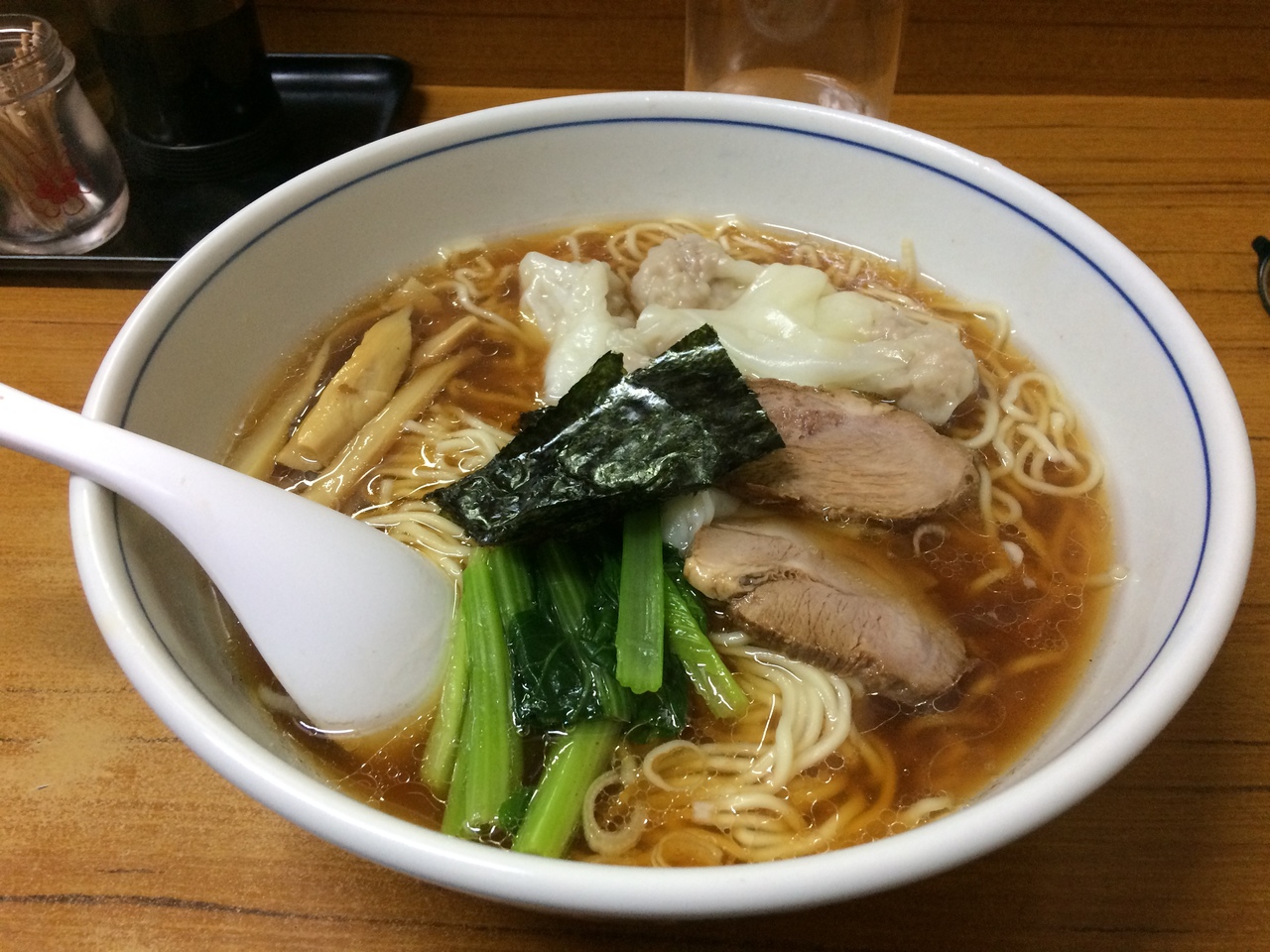 出てきたワンタン麺は1970年代に食べていたようなあっさり。しかし、スープは醤油が多めで塩気が強く、それに対して多分煮干しと鶏ガラかもなと思うくらい弱かったです。スープを飲み干さなければ、昨今流行するギトギト系と異なり健康によさそうです。ワンタンもぷりぷりして美味しかったです。ナルトが入っていればどのようなラーメンなのか訴求できそうなもんですが、なぜだか入っていませんね。店内といい、ラーメンの味といい、遠い昔を旅してきた気分に浸ることが出来ました。