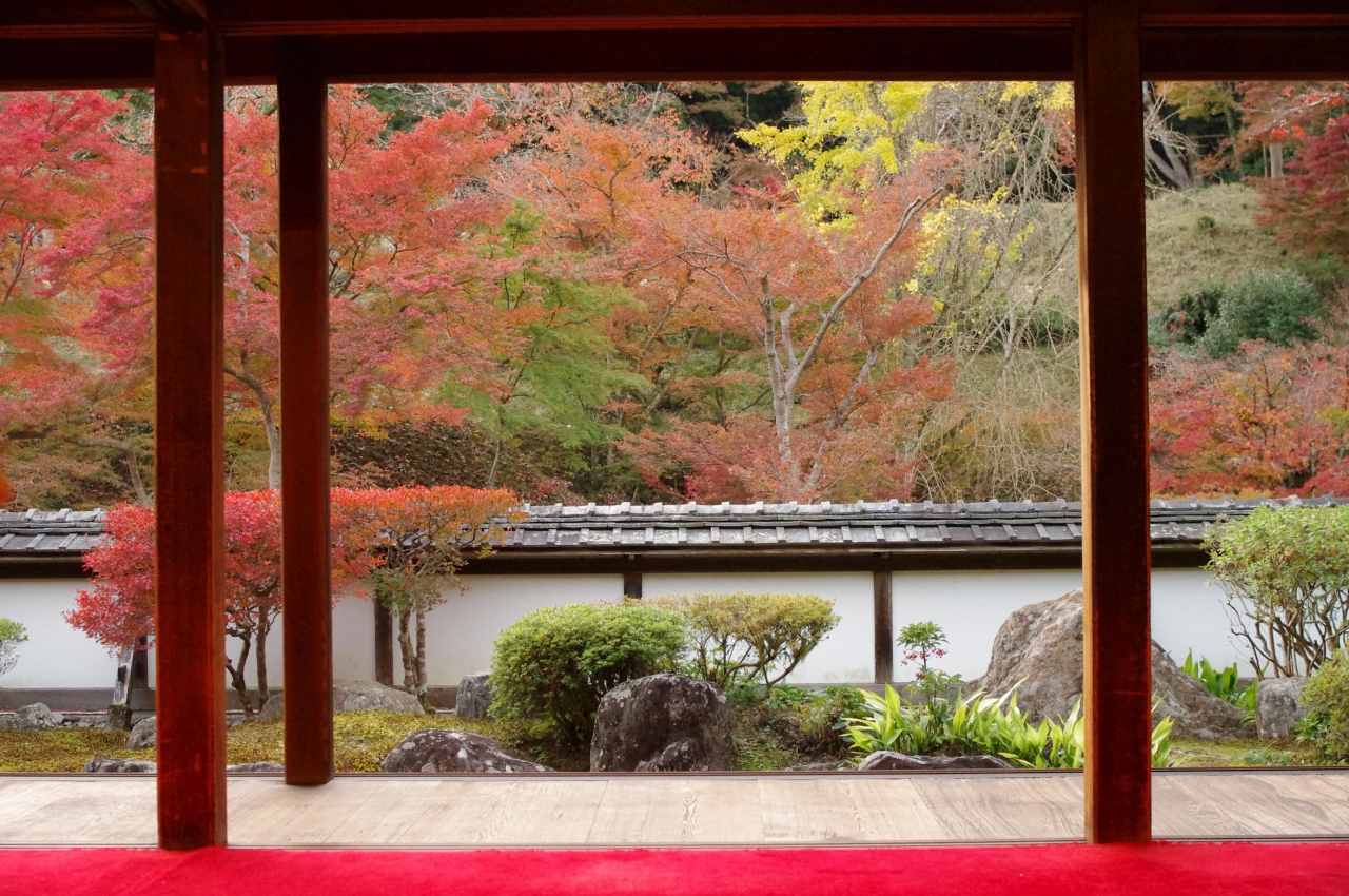 福寿院の赤いじゅうたんに座って借景庭園をゆっくり見させていただきました。